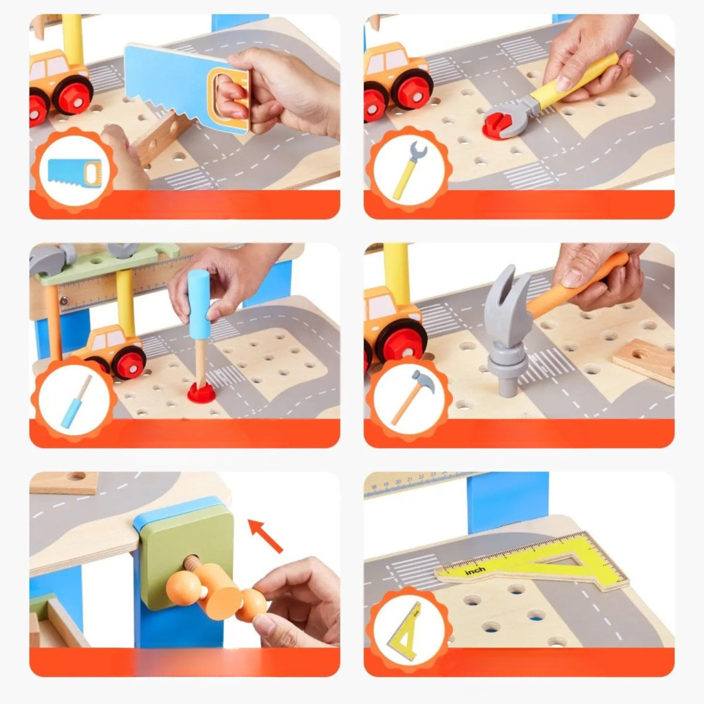 Gyerek fa szerszámasztal 62 darabos barkács játék készlet 3 éves kortól