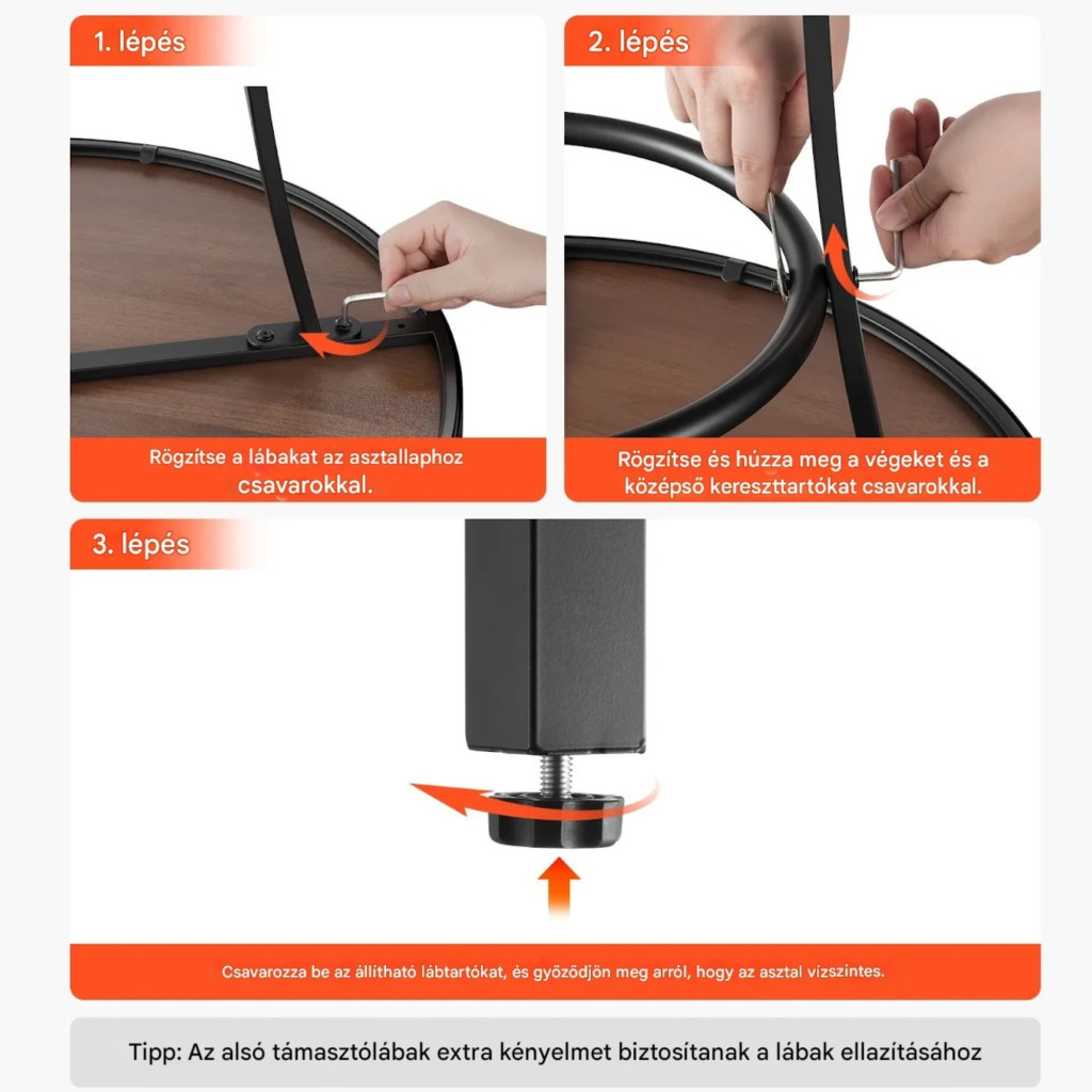 Az asztalhoz részletes útmutató és minden szükséges szerelék tartozik, így a bárasztal összeszerelése gyors és egyszerű. Az állítható lábak biztosítják a stabilitást még egyenetlen felületen is.