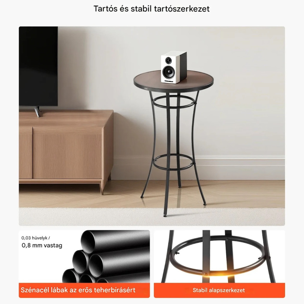 A karbonacél váz és az alsó merevítő szerkezet biztosítja a stabil használatot. A strapabíró bárasztal kialakítása lehetővé teszi, hogy poharakat, italokat vagy akár nehezebb tárgyakat is biztonságosan elhelyezzen rajta anélkül, hogy billegne.