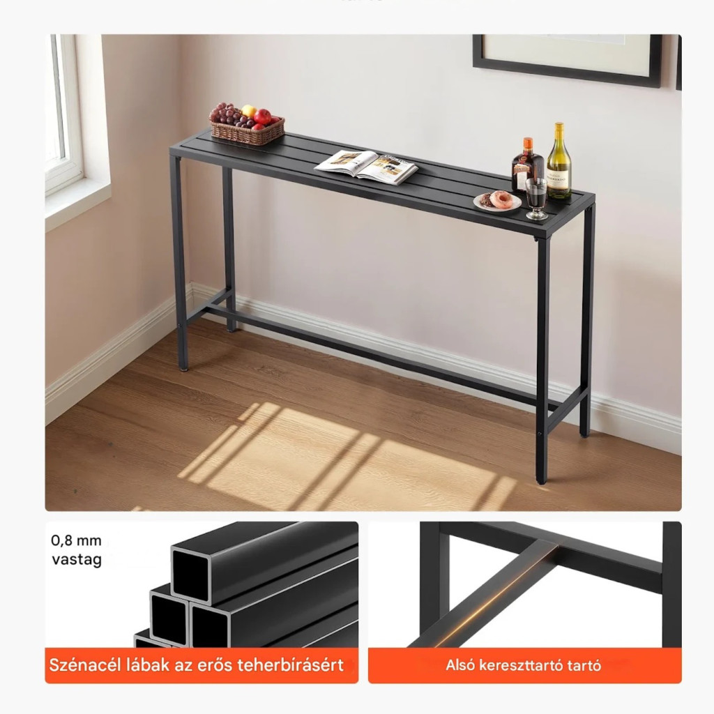 A 160 × 37,5 cm-es asztallap elegendő helyet biztosít italok, snackek vagy kisebb fogások számára, miközben keskeny kialakítása miatt könnyen elhelyezhető akár fal mellett is. A 98 cm magas álló asztal tökéletes baráti beszélgetésekhez vagy gyors étkezésekhez.