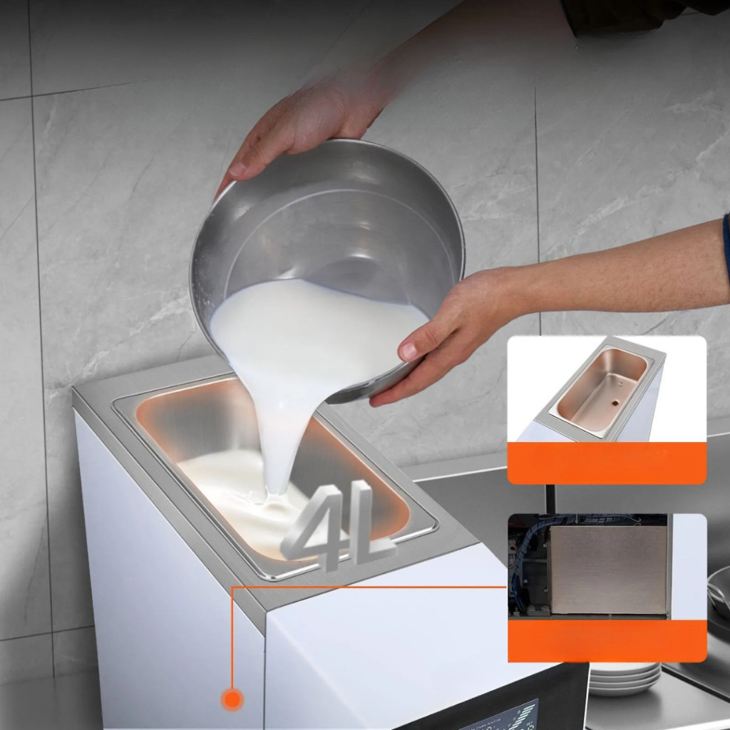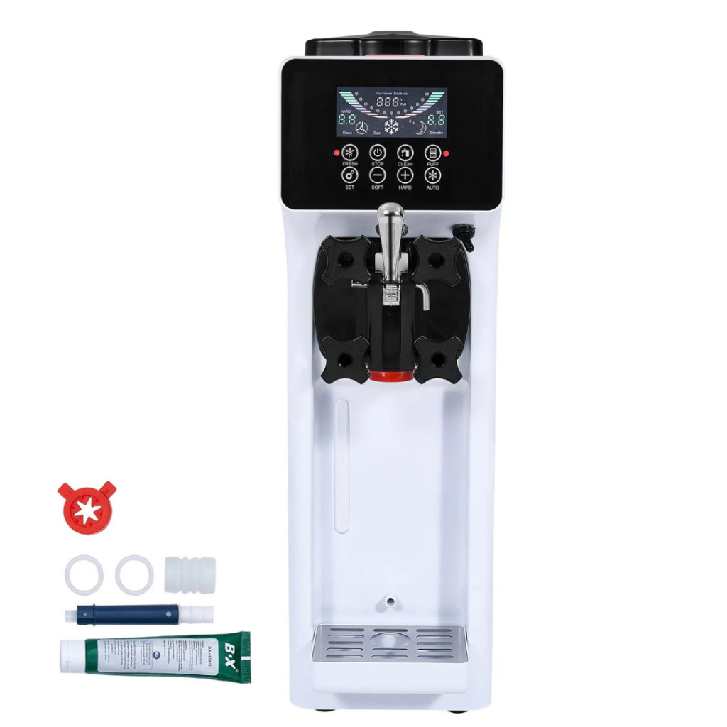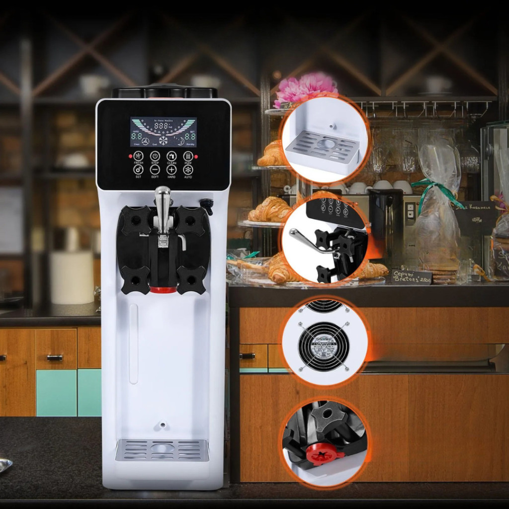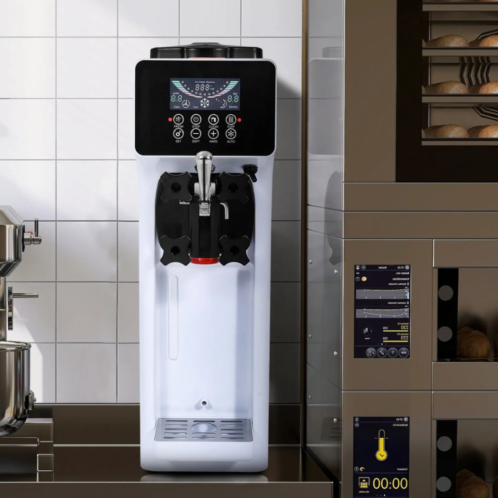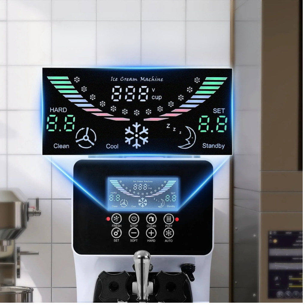 Az áttekinthető LCD-vezérlőpanel lehetővé teszi a működési idő, a maradék mennyiség és a hűtési beállítások könnyű követését. A gép rendelkezik egyérintéses automata tisztítófunkcióval, időzítővel és előhűtési lehetőséggel, ami megkönnyíti a mindennapi használatot.