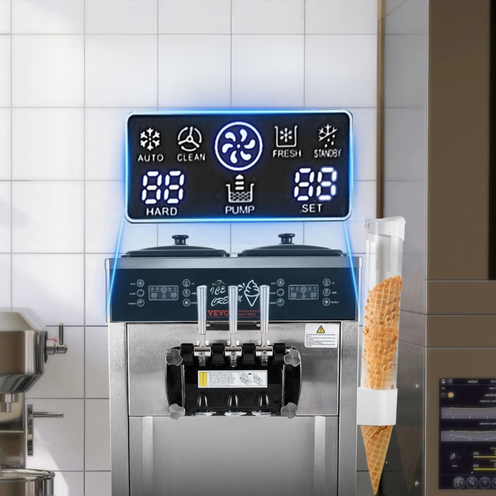 A gép modern LED vezérlőpanellel felszerelt, amely számos kényelmi funkciót kínál: automatikus hűtés, állítható fagylaltkeménység, egygombos tisztítás és időzítő. A kijelzőn a gyártási idő és mennyiség azonnal nyomon követhető, így a használat gyors és hatékony.