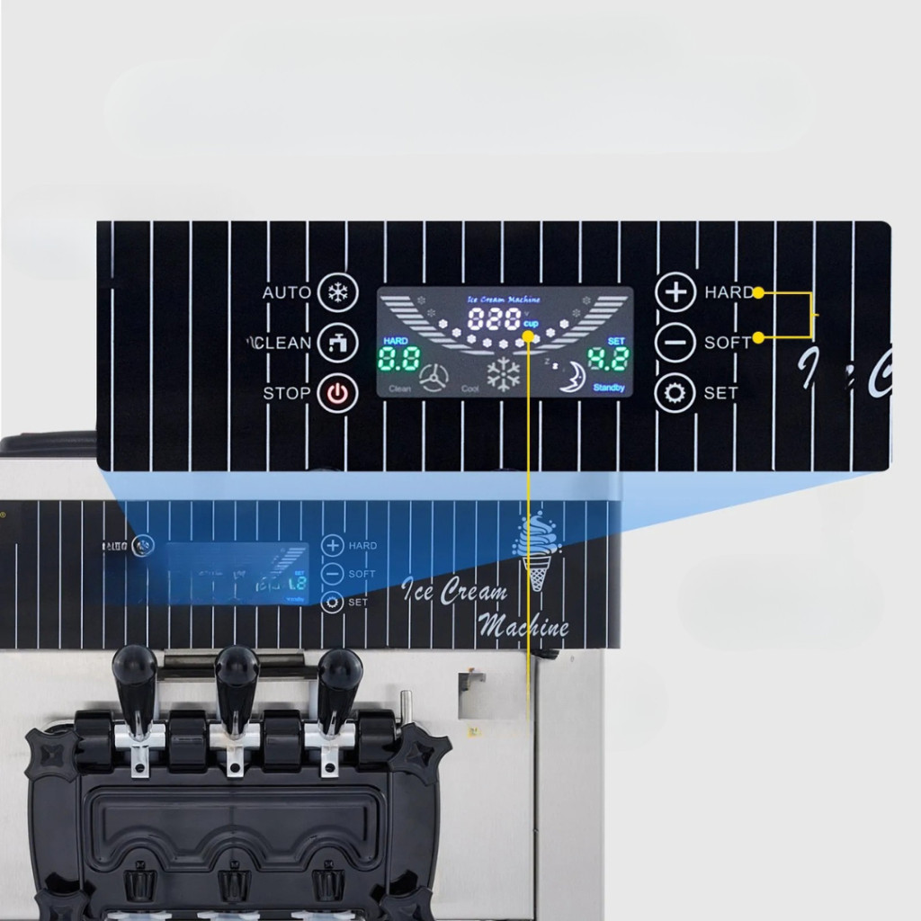 Az LCD-kijelző segítségével pontosan beállíthatja a hőmérsékletet, a keménységi fokot és az elkészítési időt. A kijelzőn a fagylalt mennyisége is nyomon követhető, és egyetlen gombnyomással aktiválható az automatikus öntisztító funkció.