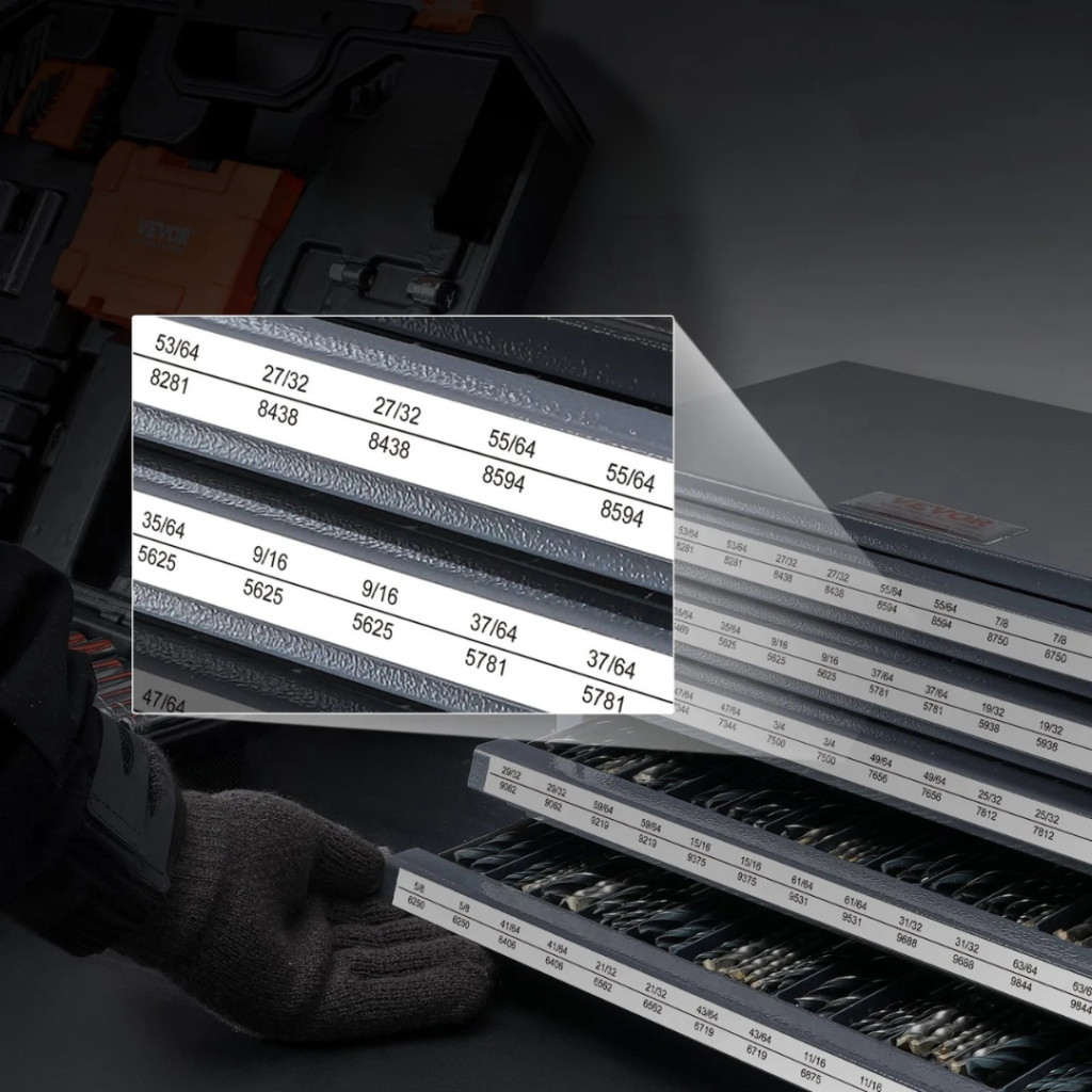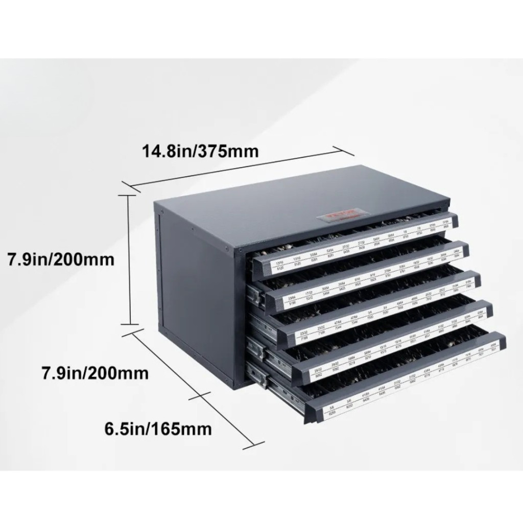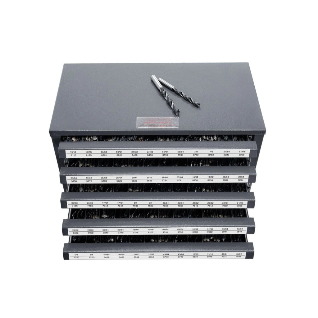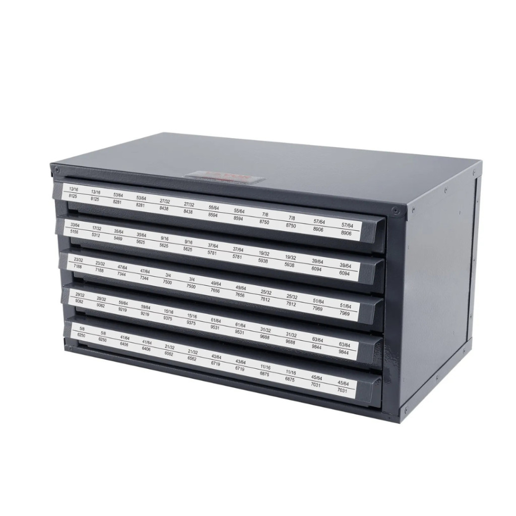 Professzionális acél fúrószár-tároló szekrény 5 fiókos, 60 rekeszes, 13,1–25 mm mérettartományhoz