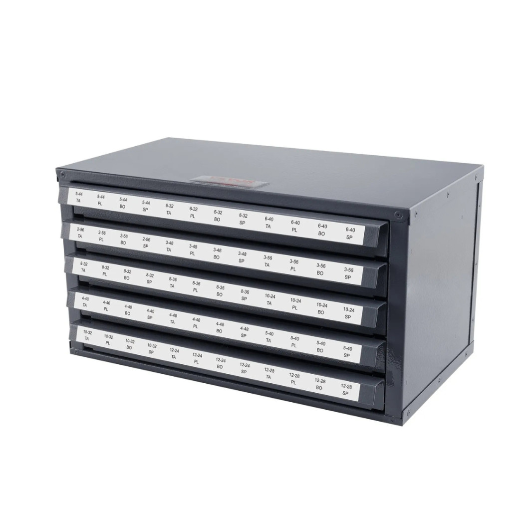 A menetfúrók rendszerezett tárolása nélkülözhetetlen minden olyan műhelyben, ahol a gyors hozzáférés és az átlátható elrendezés alapkövetelmény. Ez a masszív, acélból készült, 5 fiókos tárolószekrény kifejezetten a #2-56–#12-28 méretű menetfúrók biztonságos és rendezett elhelyezésére szolgál. A 60, jól látható címkével ellátott rekeszlehetővé teszi, hogy pillanatok alatt megtalálja a szükséges szerszámot, így időt takarít meg és növeli a munkafolyamat hatékonyságát.
