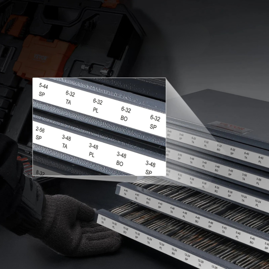 A címkézett rekeszek révén a menetfúrók mérete egy pillanat alatt beazonosítható, így minimálisra csökken a keresési idő és a munkamegszakítás. Minden szerszám a saját helyére kerül, ami növeli a műhely rendezettségét és hatékonyságát.
