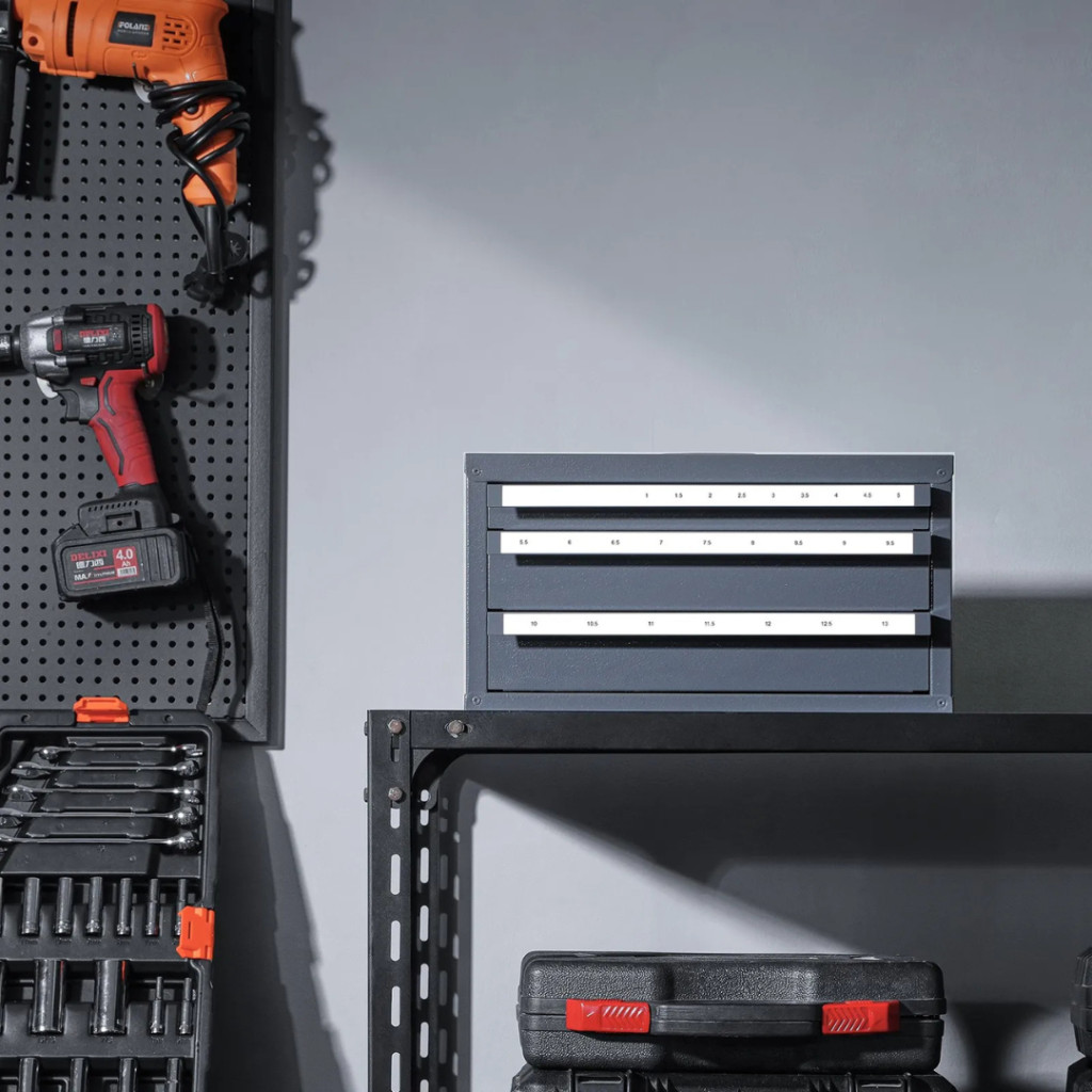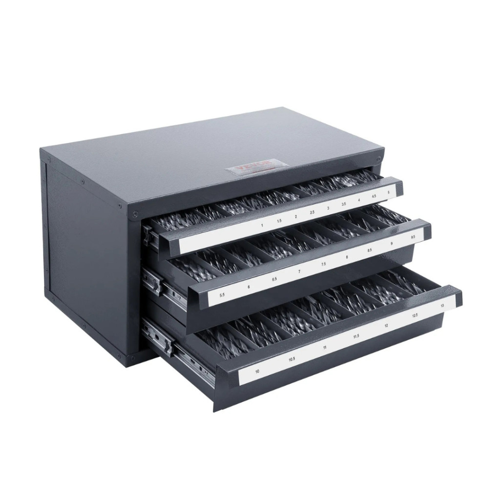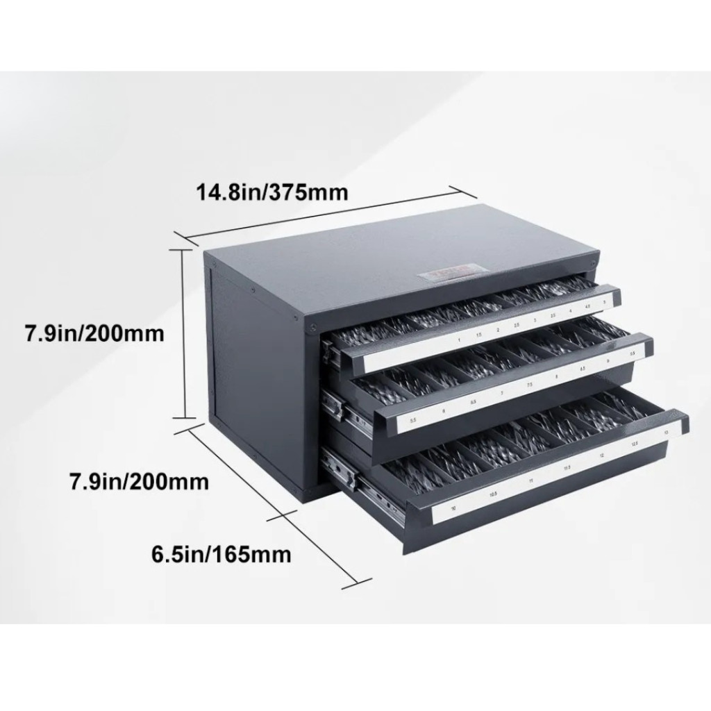 Professzionális acél fúrószár-tároló szekrény 3 fiókos, 29 rekeszes, 1–13 mm mérettartományhoz