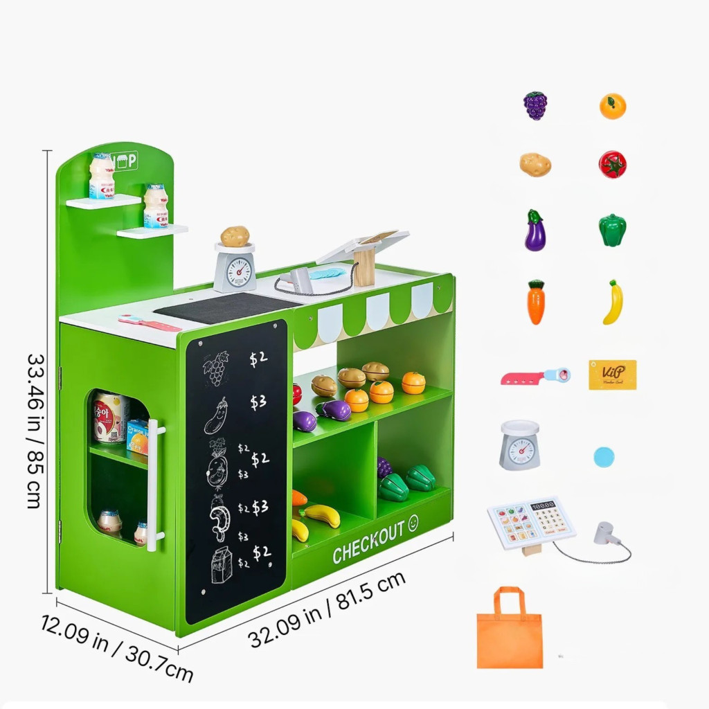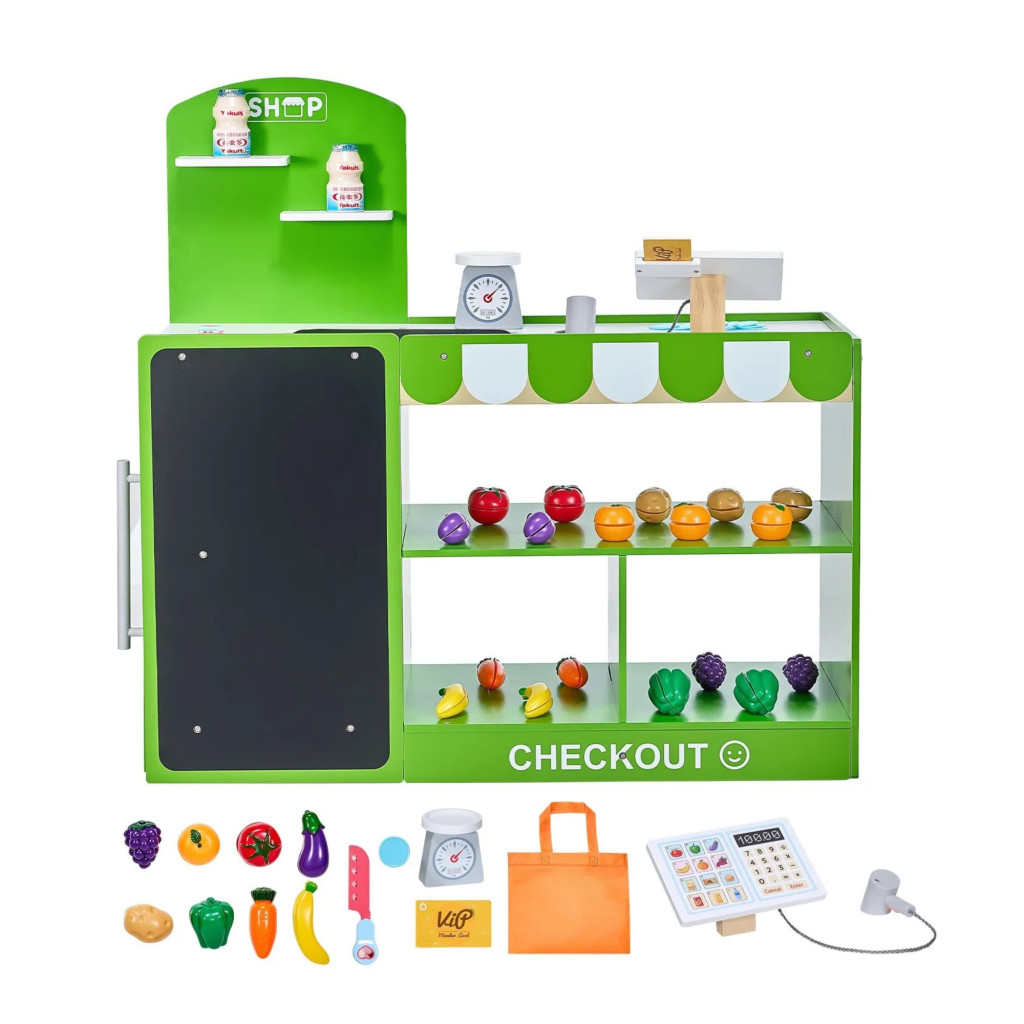 Gyerek játékbolt fa kivitelben 35 részes szupermarket játékszett pénztárral
