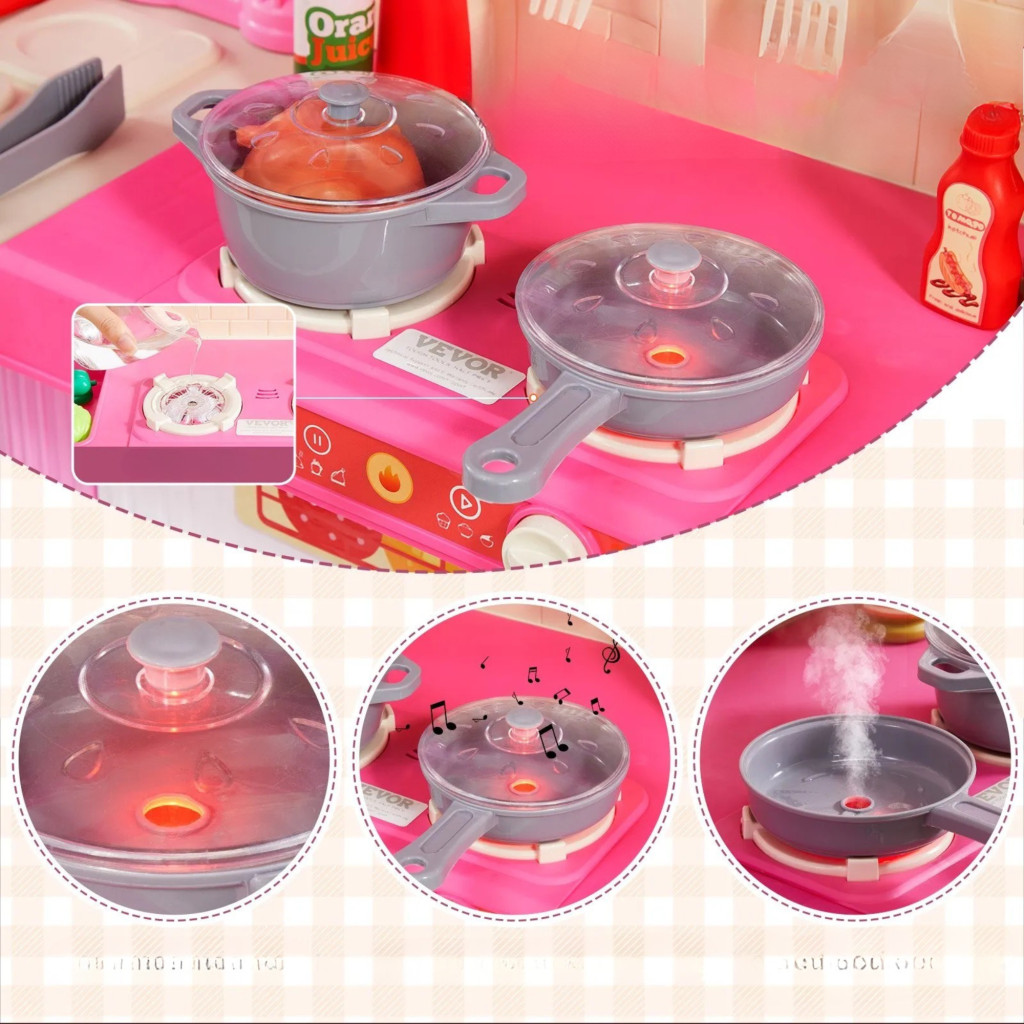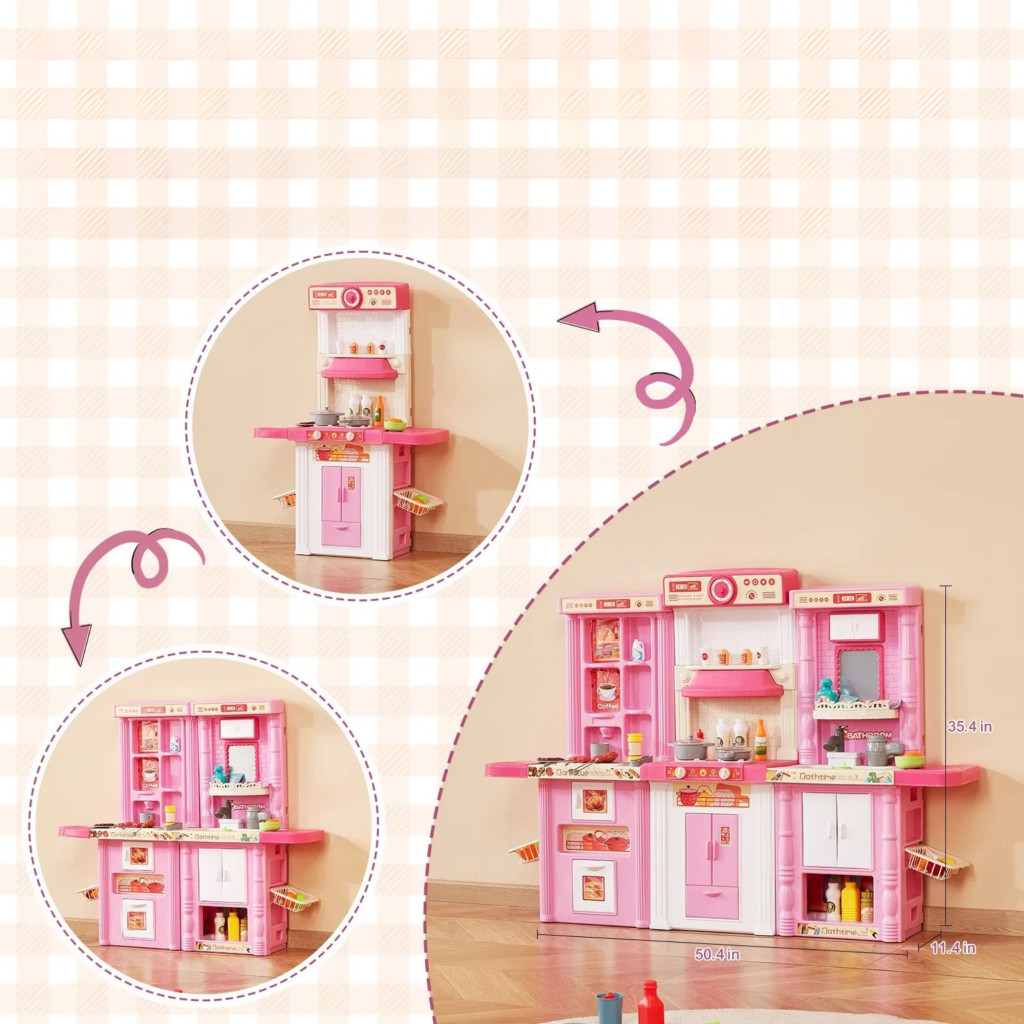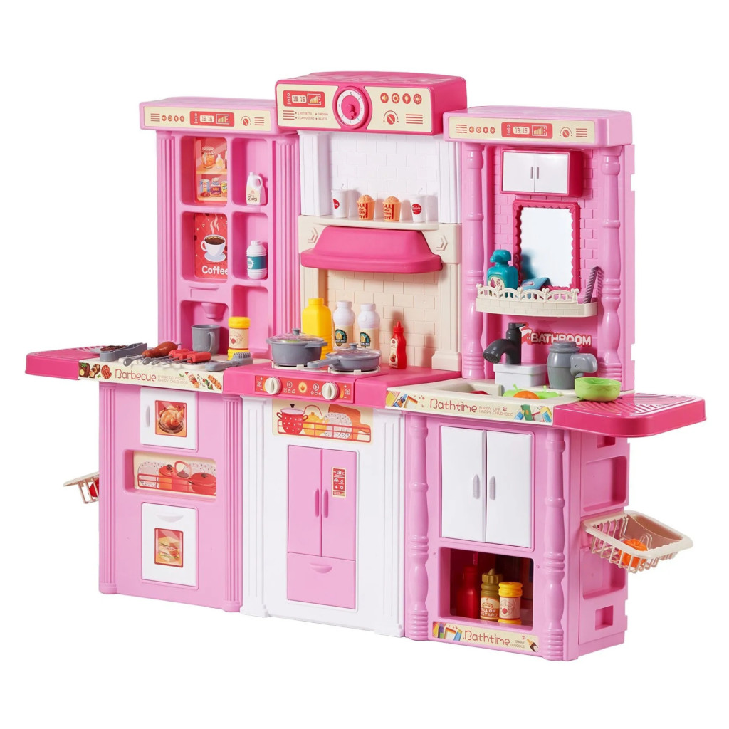 Gyerek játékkonyha 3 az 1-ben rózsaszín konyha gőz funkcióval, fénnyel és hanggal, 74 kiegészítővel