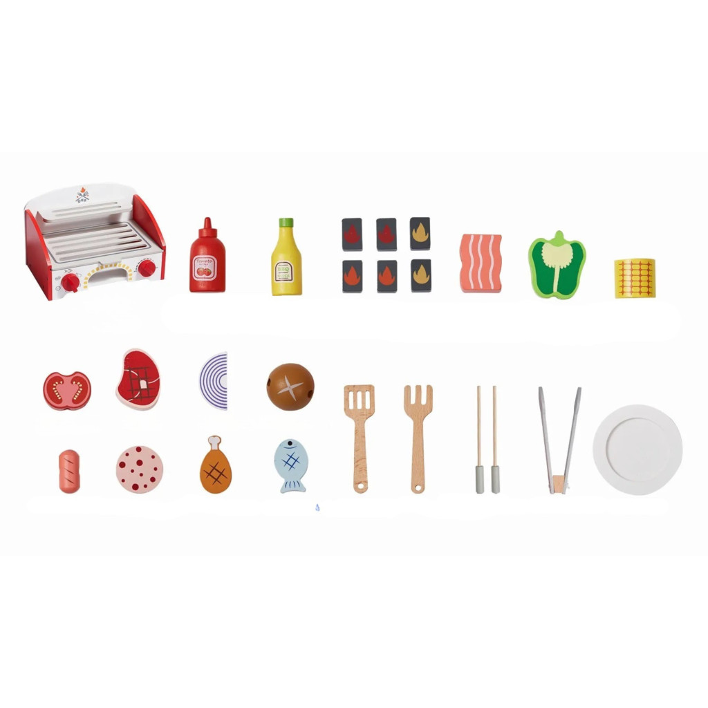 A fa grill játék szett minden szükséges elemet tartalmaz: