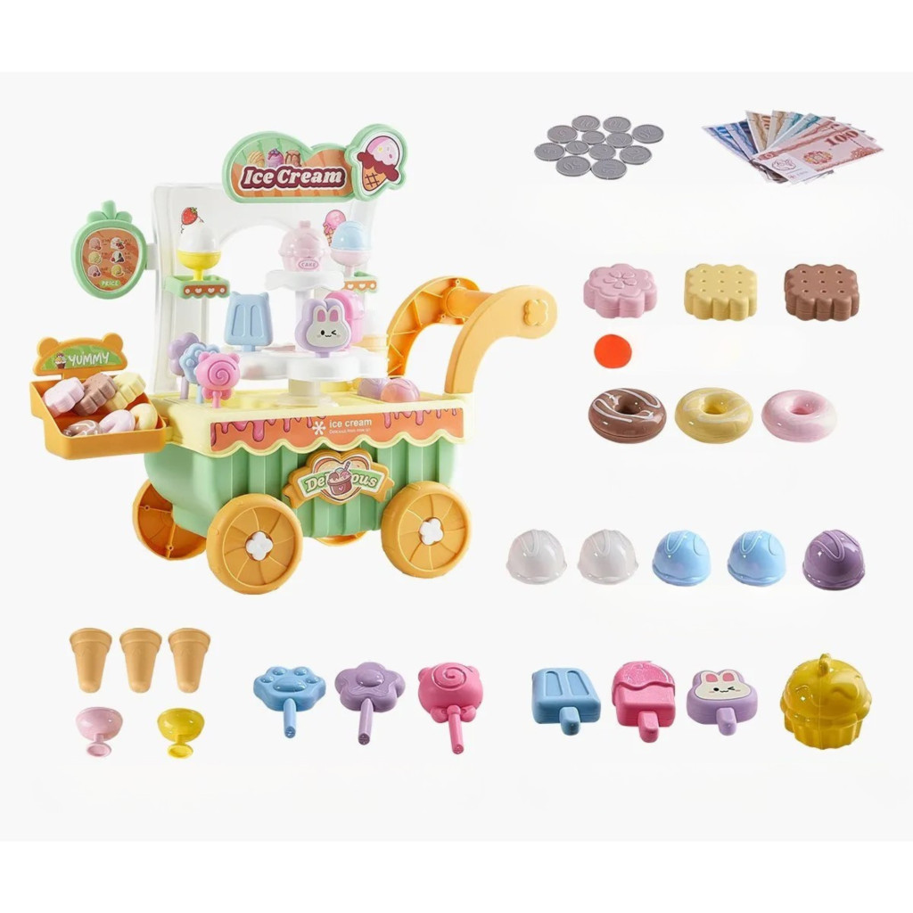 Ez a gyerek fagylaltos játék lehetővé teszi, hogy gyermeke eladóként próbálja ki magát. A játék során: