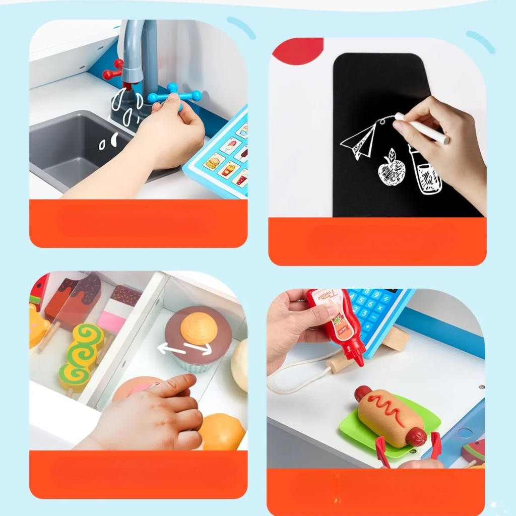 A gyermek szabadon kombinálhatja az elemeket, így minden játék alkalom egy új történet kezdete. A gyerek játék konyha fagylaltos kocsival valódi élményt nyújt.