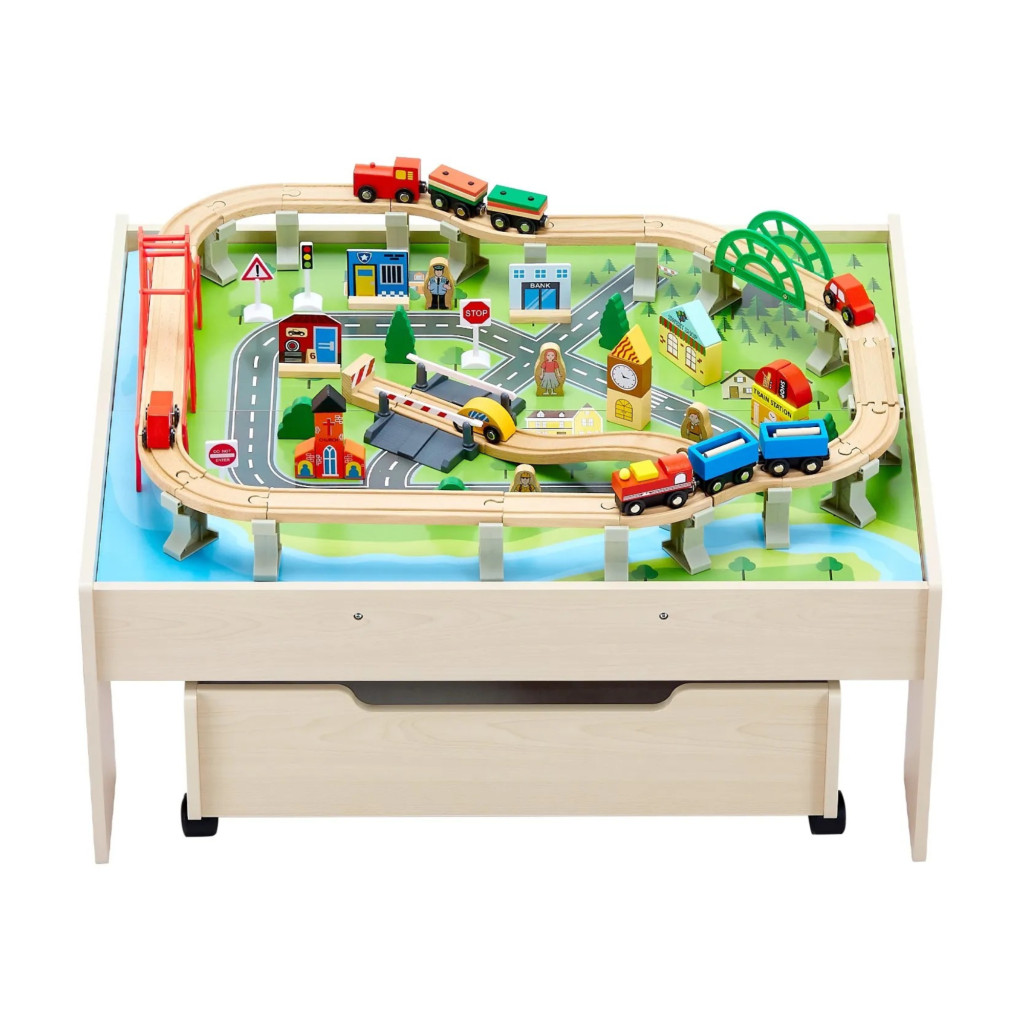 Ez a fa vasút játékasztal gyerekeknek nemcsak szórakoztató, hanem fejlesztő hatású is: