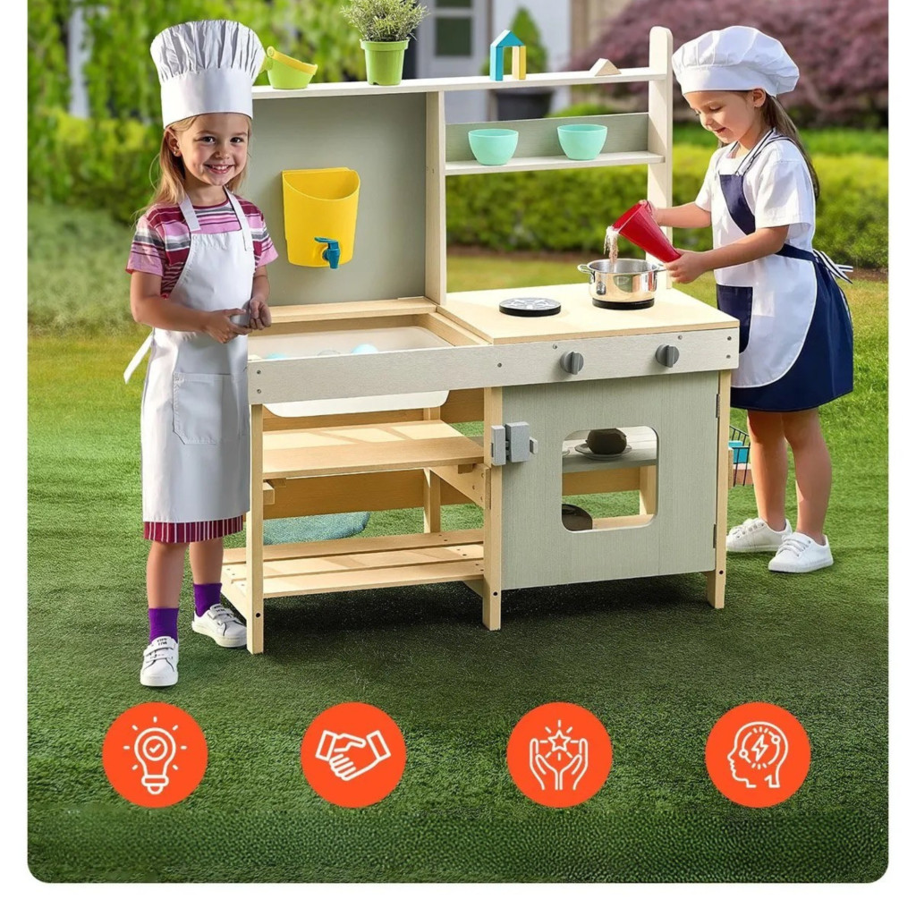 Ez a gyerek sárkonyha egy nagyméretű, strapabíró és fejlesztő játék, amely a szabadban ösztönzi a kreativitást és az önálló játékot.
