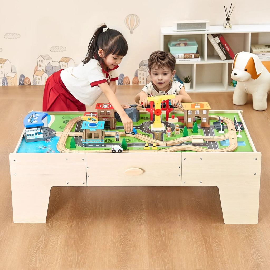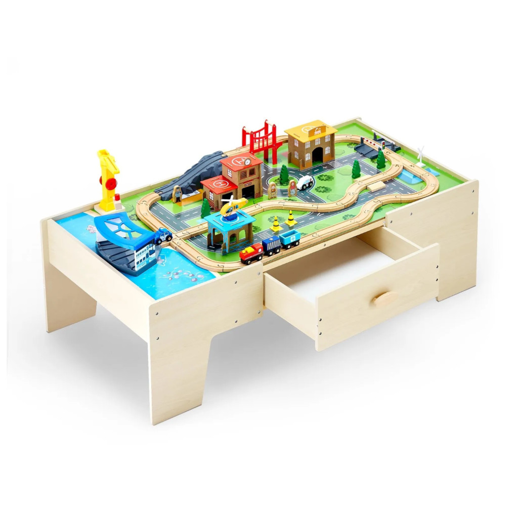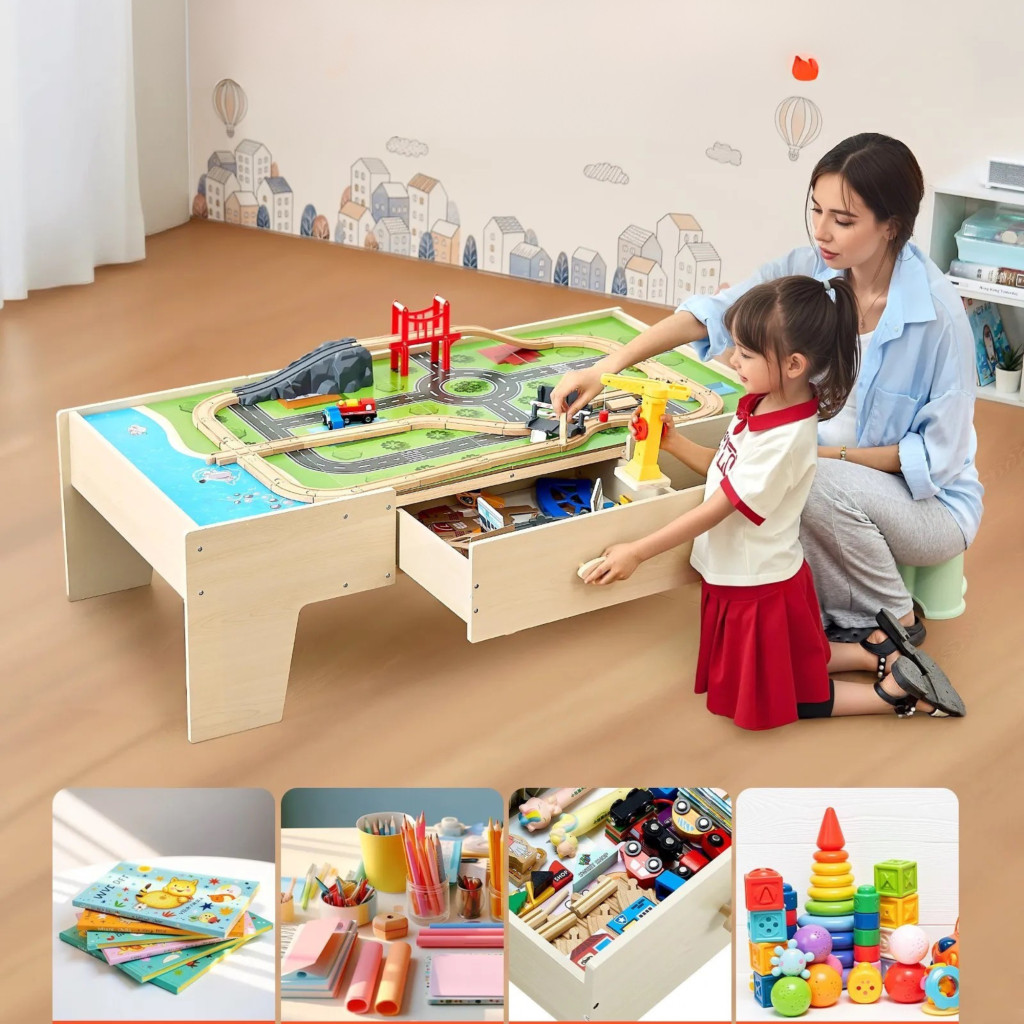 Fa gyerek játékasztal 62 darabos szett játszóasztal nagy fiókkal, 3 az 1-ben vonatkészlet kreatív játékkészlet 3 éves kortól