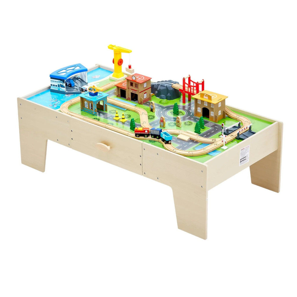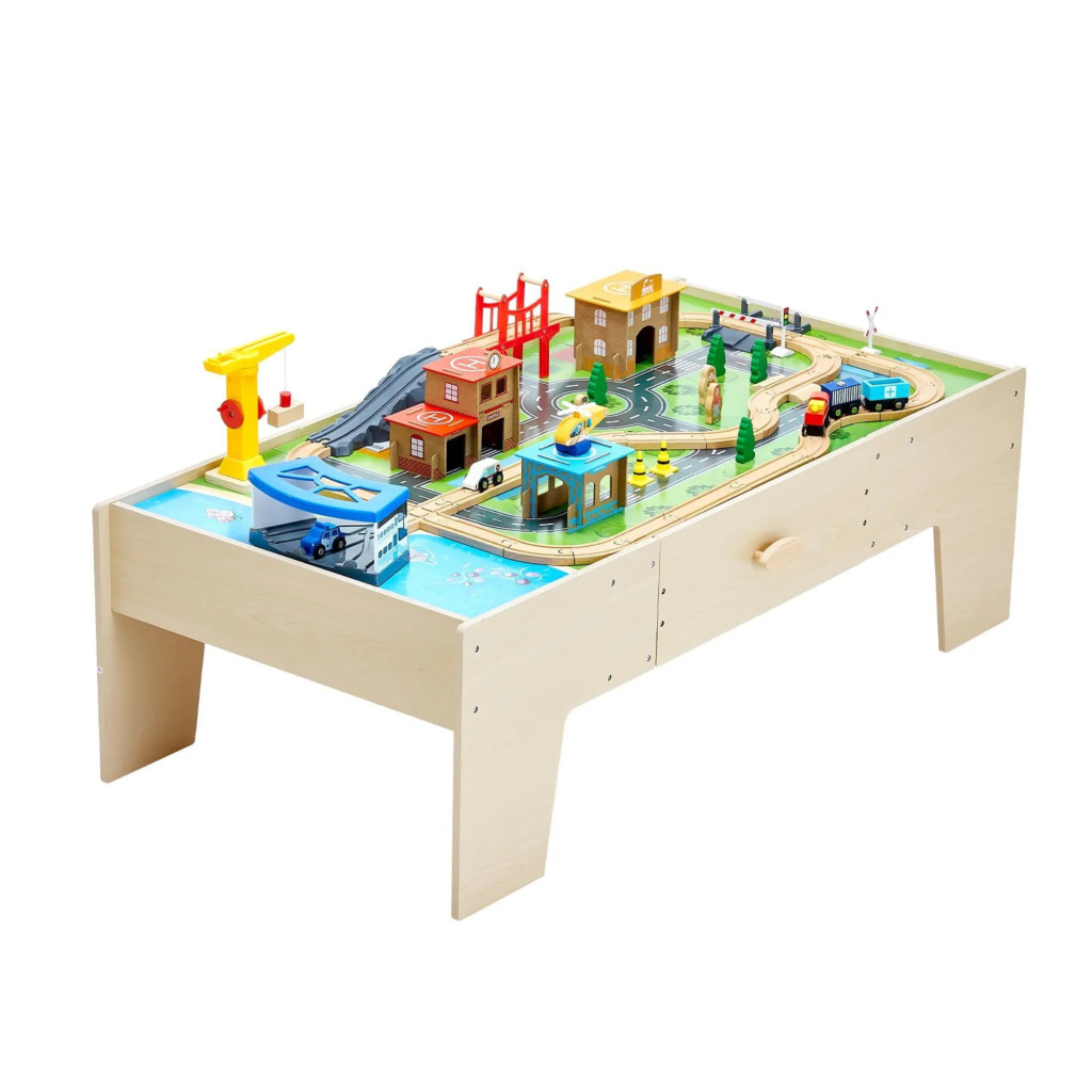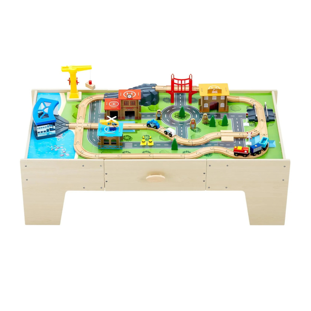 Fa gyerek játékasztal 62 darabos szett játszóasztal nagy fiókkal, 3 az 1-ben vonatkészlet kreatív játékkészlet 3 éves kortól