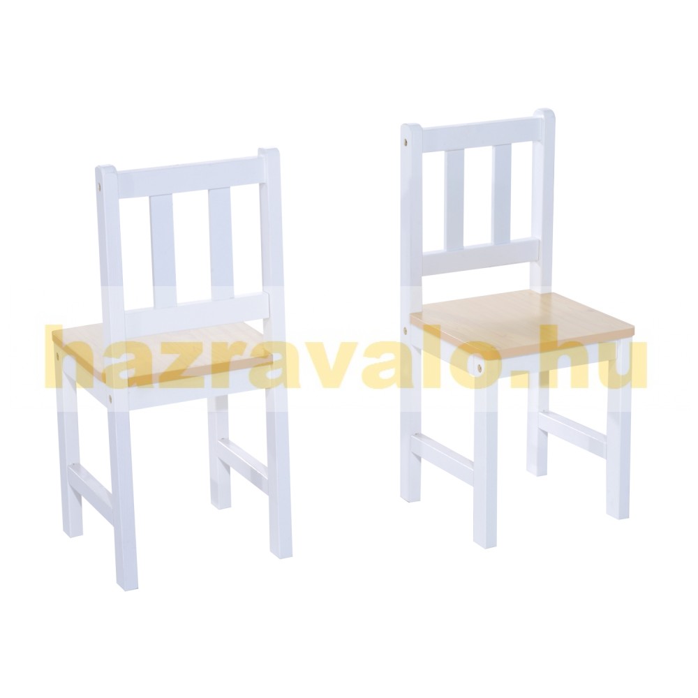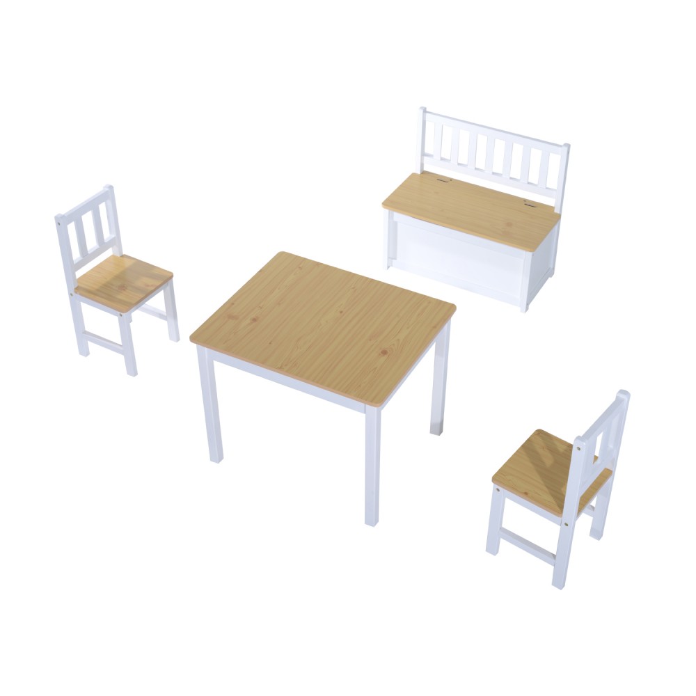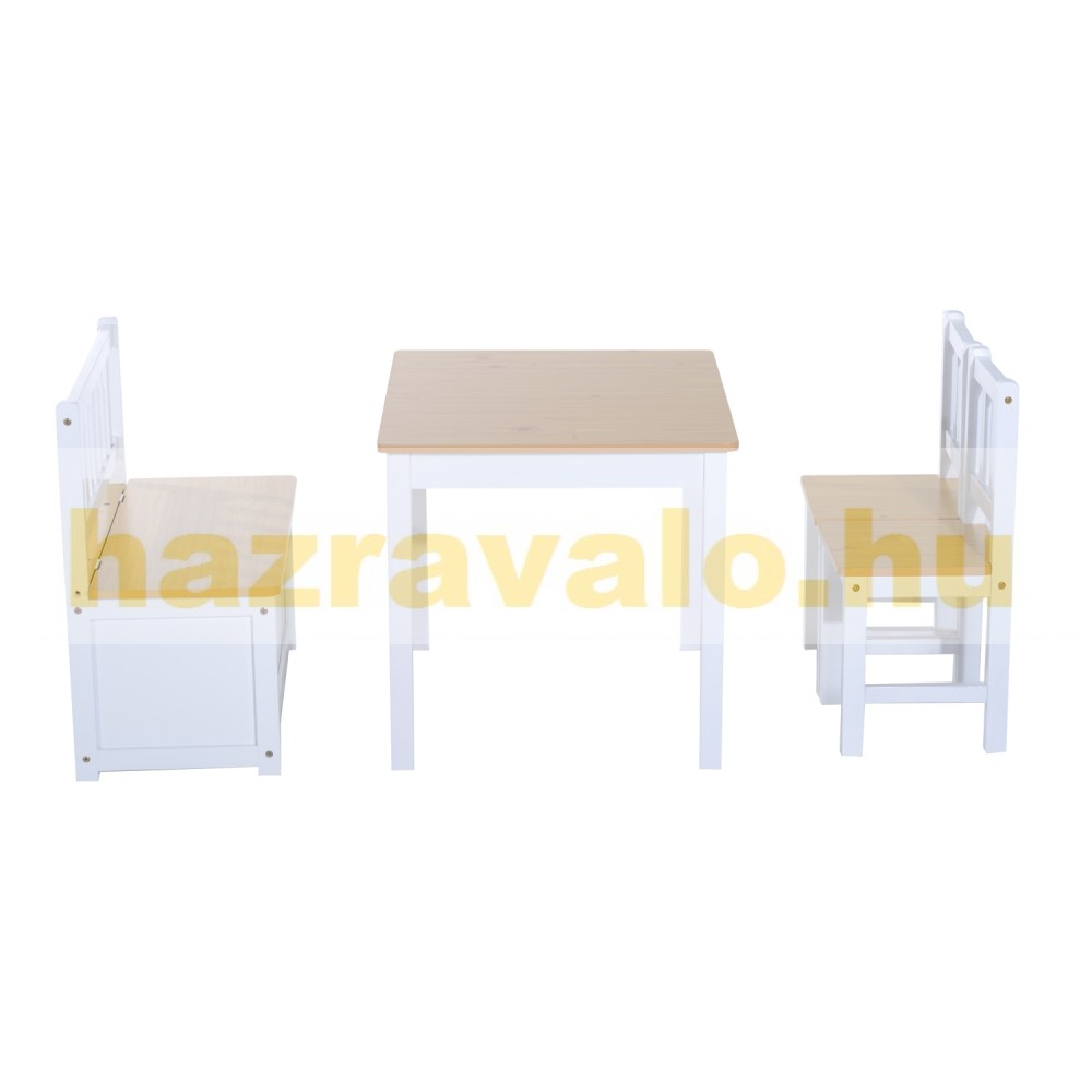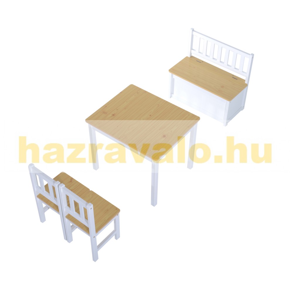 Ez a gyermekeknek készült asztal- és székkészlet remekül kiegészíti a gyermekszobát. 2 székkel, asztallal és tárolópaddal rendelkezik. Fenyőfából és MDF lapból készült, így robusztus és tartós. A tárolópad nagyon hasznos lehet, mivel az ülés alatt tárolhat tárgyakat.