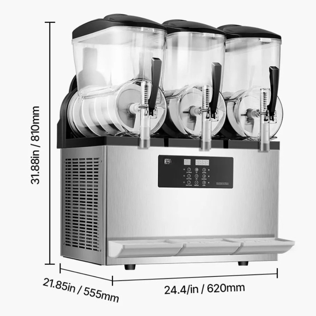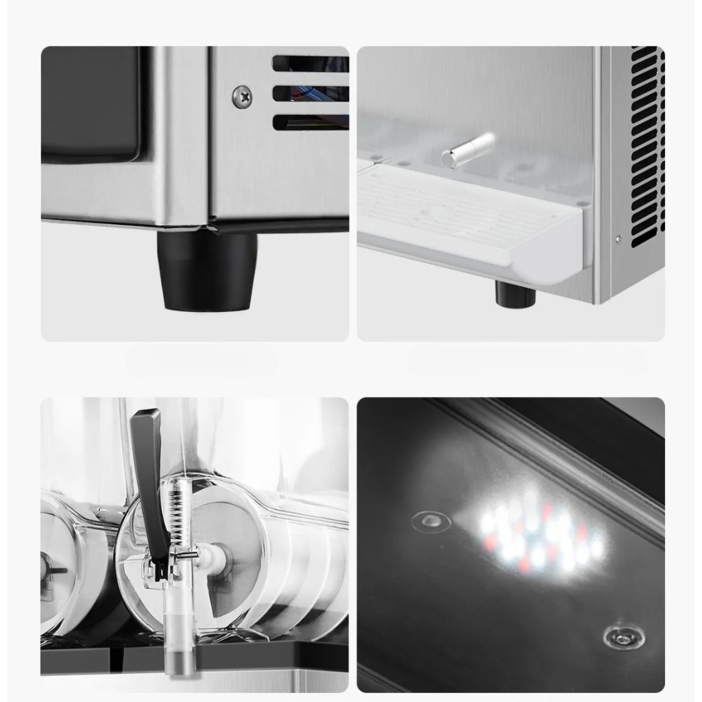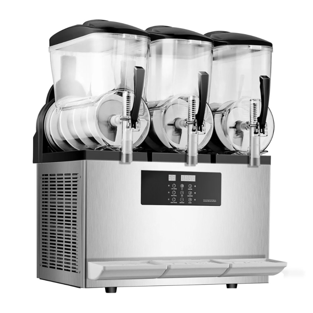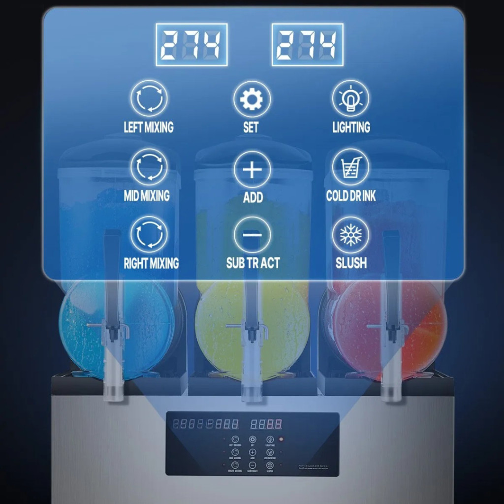 Ez a kereskedelmi minőségű, három tartályos jégkása készítő gép ideális választás forgalmas vendéglátóhelyek, bárok, cukrászdák, kávézók és rendezvényszervezők számára. Nagy kapacitásával és precíz hőmérséklet-szabályozásával lehetővé teszi jégkása, smoothie, jeges koktél és hűsítő üdítőitalok gyors és egyenletes előállítását.