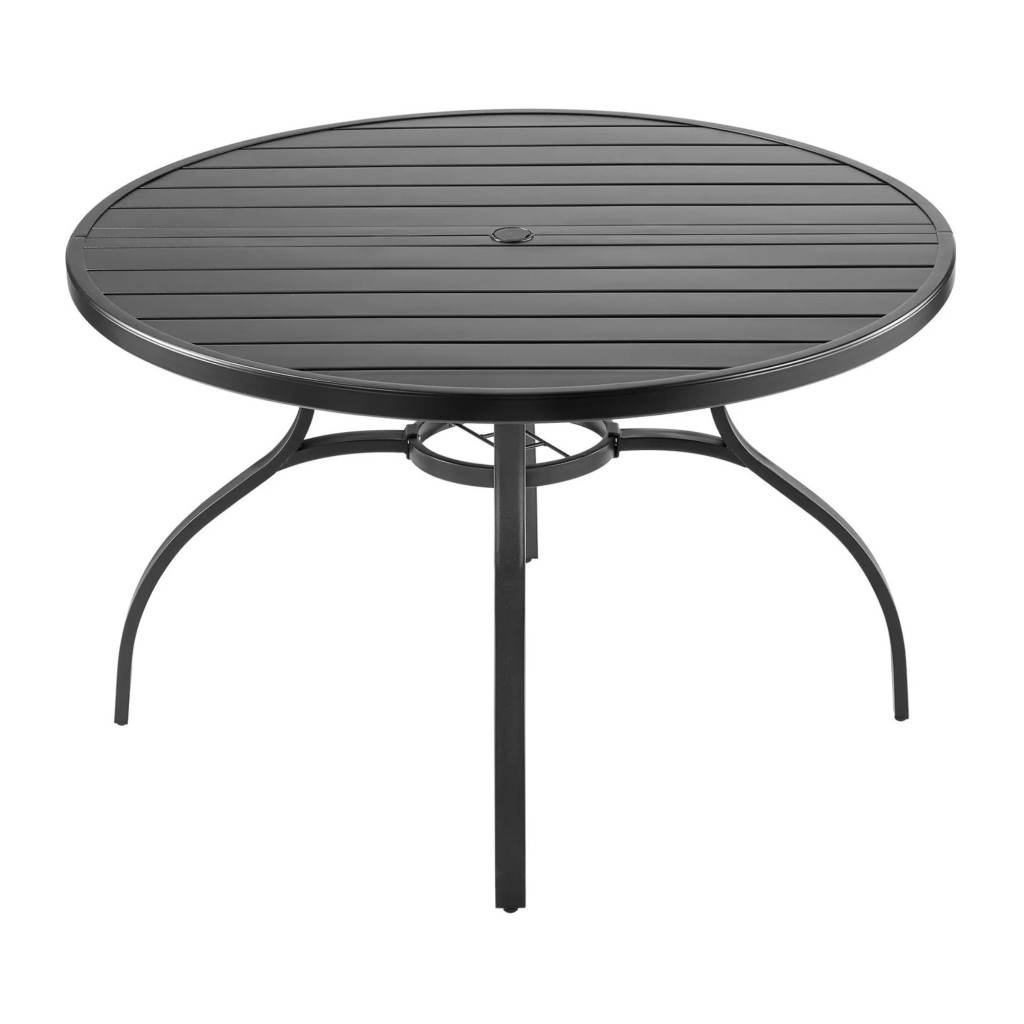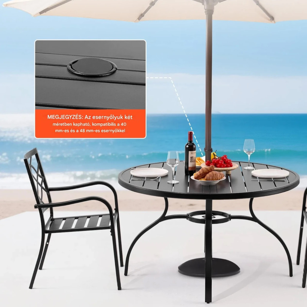 Tegye még kényelmesebbé és stílusosabbá a szabadtéri étkezéseket ezzel a modern kialakítású kerek kerti asztalmodellel. A letisztult fekete megjelenés, a masszív acél szerkezet és a praktikus napernyő nyílás ideális választássá teszi kertbe, teraszra vagy erkélyre.