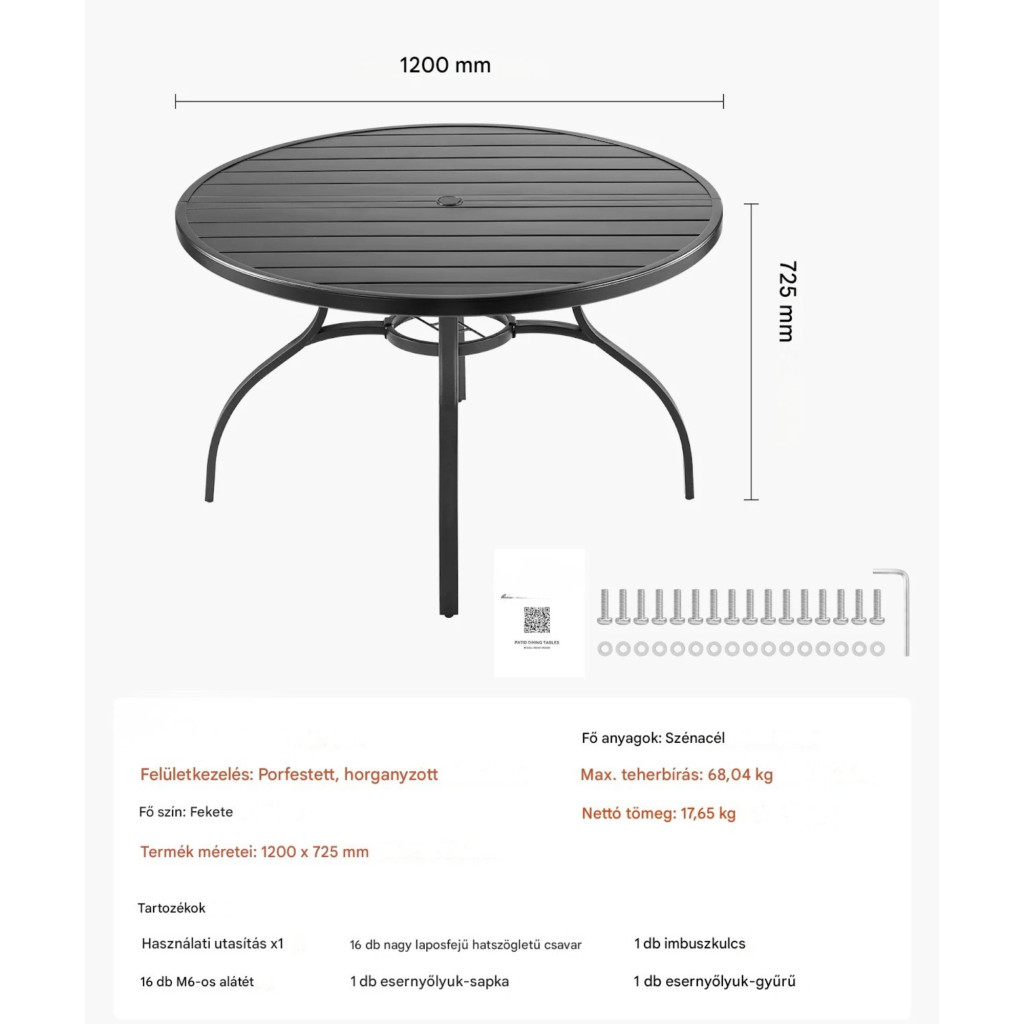 Ez a kerek kültéri asztal ideális választás, ha Ön egy strapabíró, időjárásálló és modern megjelenésű megoldástkeres. A masszív acél szerkezet, a praktikus napernyő kialakítás és a tágas méret garantálja, hogy hosszú távon is kényelmes és megbízható kiegészítője lesz kertjének.