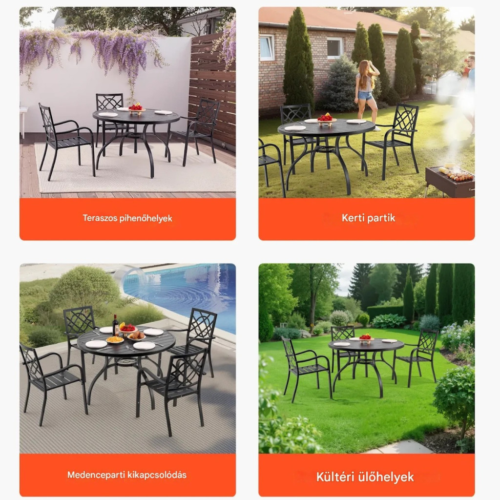 Az elegáns fekete szín minimalista, modern stílust képvisel, amely könnyedén illeszkedik bármilyen kültéri környezetbe. Ez a fém kerti asztal nemcsak praktikus, hanem esztétikai értéket is ad kertjének.