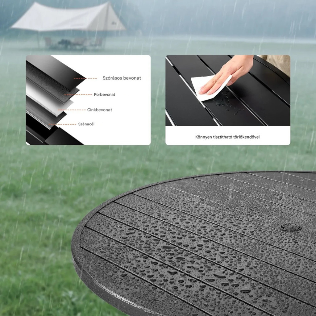Az asztal horganyzott szénacélból készült, amelyet porfestett bevonat véd. Ez biztosítja, hogy a időjárásálló kerti asztal ellenálljon az esőnek, napsütésnek és egyéb külső hatásoknak. A felület könnyen tisztítható, nem igényel különleges karbantartást.