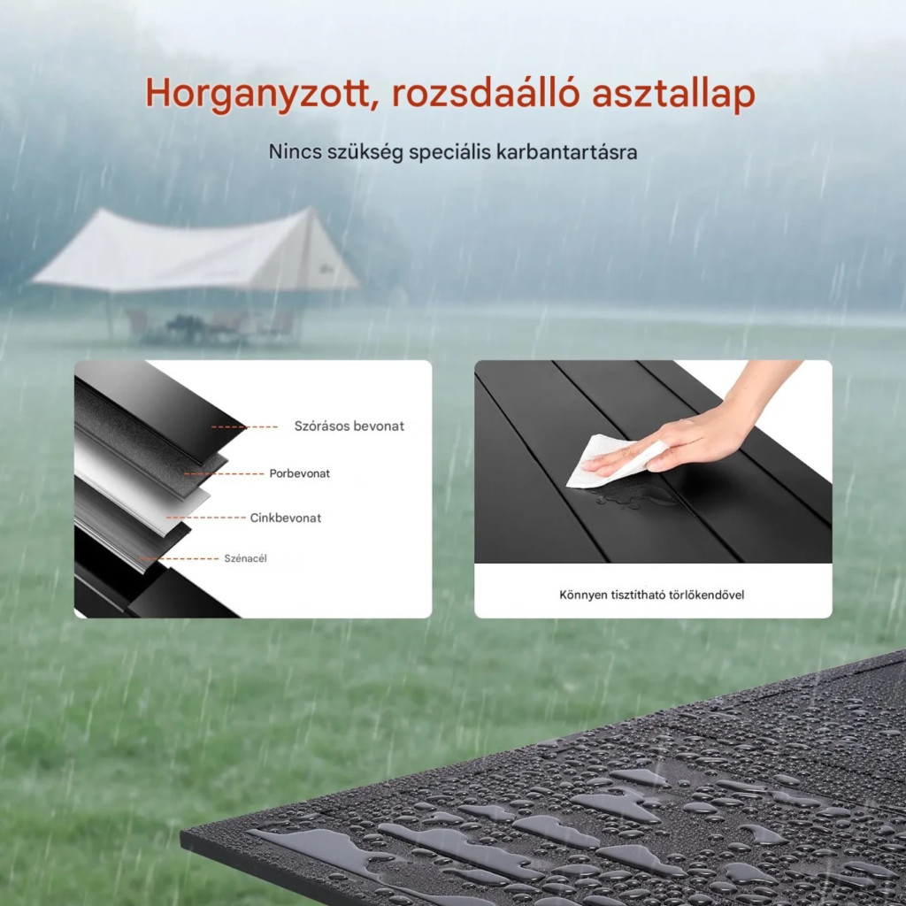 Az asztal horganyzott szénacélból készült, amelyet porfestett bevonat véd. Ez a kombináció biztosítja, hogy az asztal ellenálljon az esőnek, napsütésnek és egyéb külső hatásoknak. A felület könnyen tisztítható – egy nedves törlés elegendő a tisztán tartáshoz.