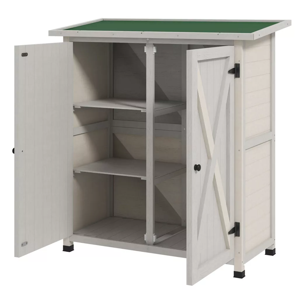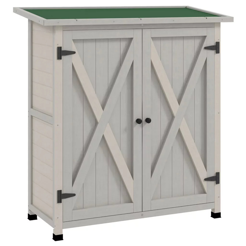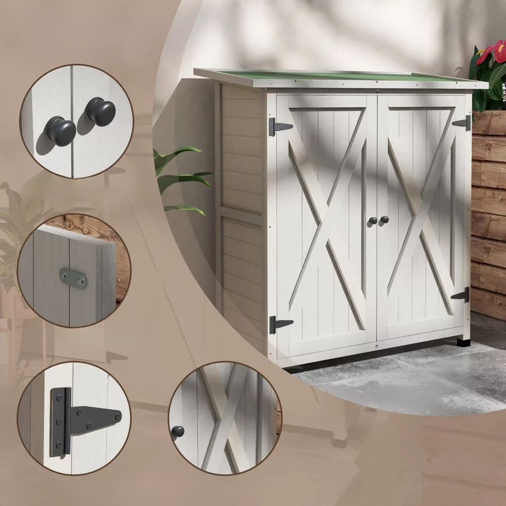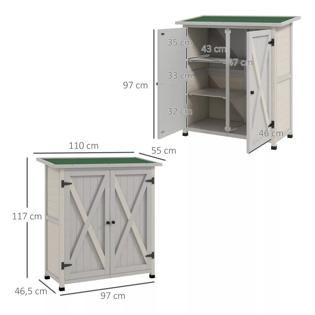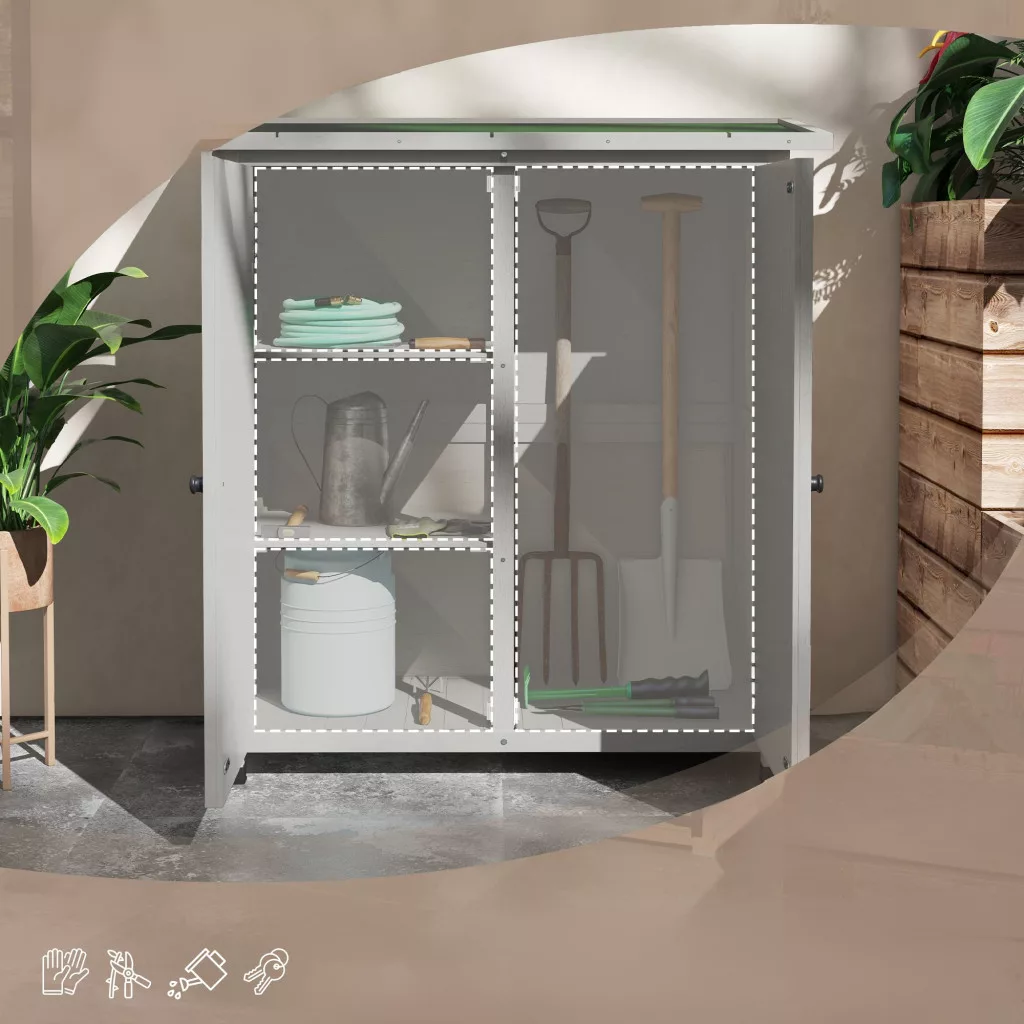 A dupla ajtós kerti szerszámos szekrény lehetővé teszi a tárolt eszközök gyors és kényelmes elérését.