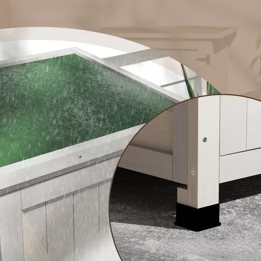 A fenyőfa kerti tárolószekrény vízálló bevonattal készült, amely ellenáll az időjárás hatásainak.
