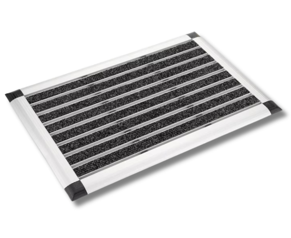 Alumínium profilos, durvaszálas szürke lábtörlőszőnyeg. Védi a padlót a a portól, sártól és ebből adódó károktól, szennyeződésektől. Nem igényel külön karbantartást. Könnyen tisztítható nagynyomású mosó segítségével. A durvaszálas kialakítása hatékonyan távolítja el a szennyeződéseket a cipőről.