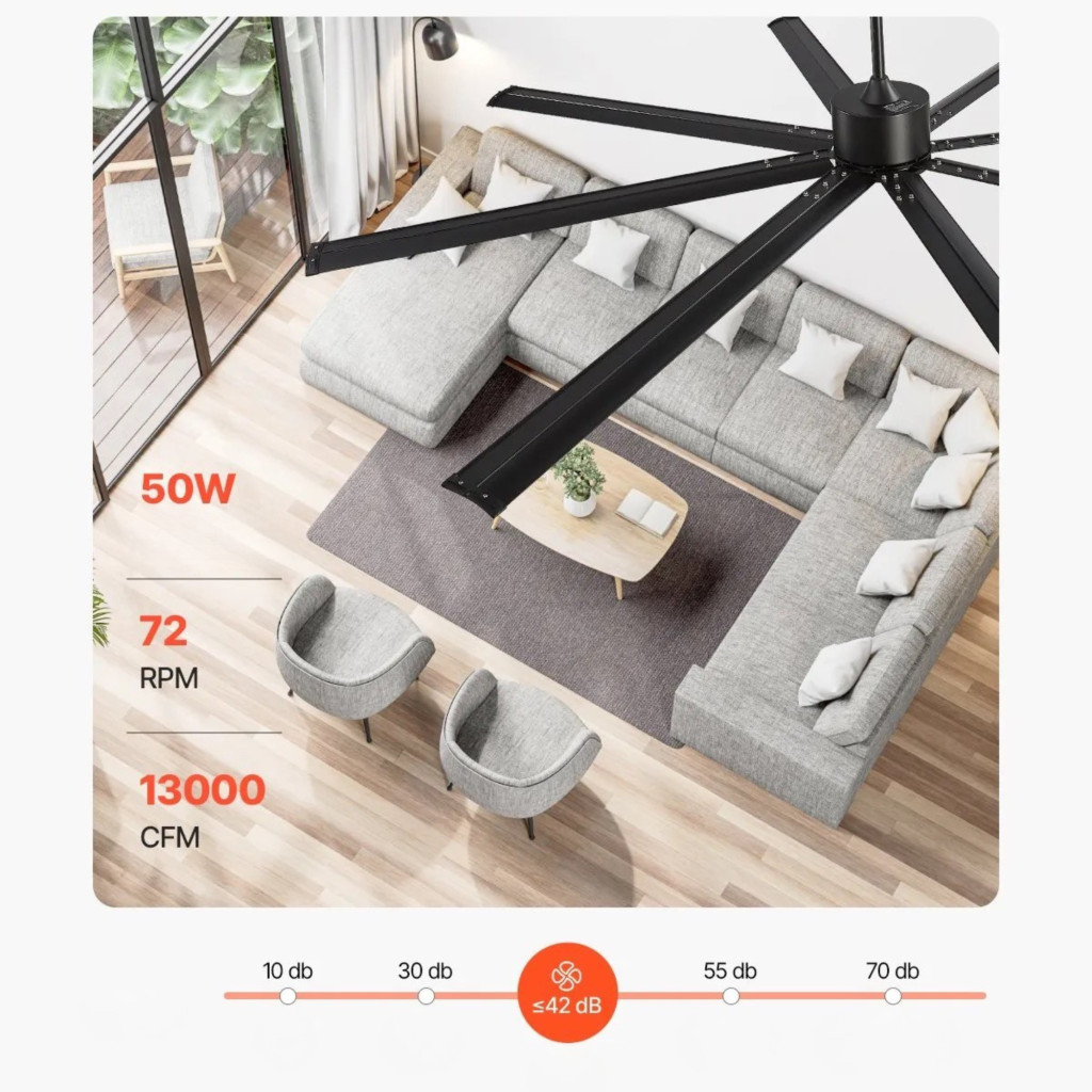 A korszerű egyenáramú (DC) motor mindössze 54 W teljesítménnyel működik, miközben akár 13 000 CFM (≈ 22 100 m³/óra) légszállításra képes. A működés rendkívül halk, a zajszint ≤ 42 dB, így éjszaka sem zavarja a pihenést – kiváló választás hálószobai mennyezeti ventilátorként is.