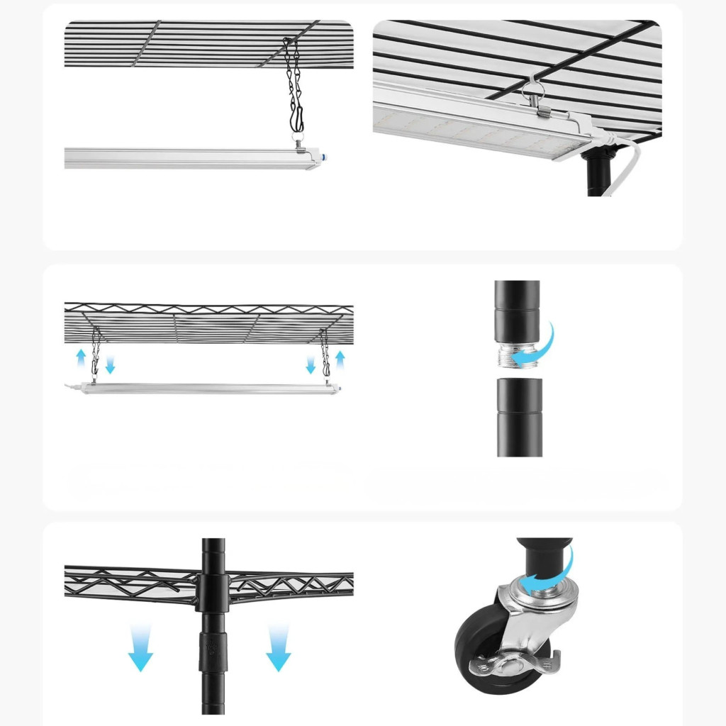 A növénynevelő állvány LED világítással minden szükséges alkatrésszel együtt érkezik. Az összeszereléshez nincs szükség speciális szerszámokra, így az állvány gyorsan és egyszerűen felállítható.