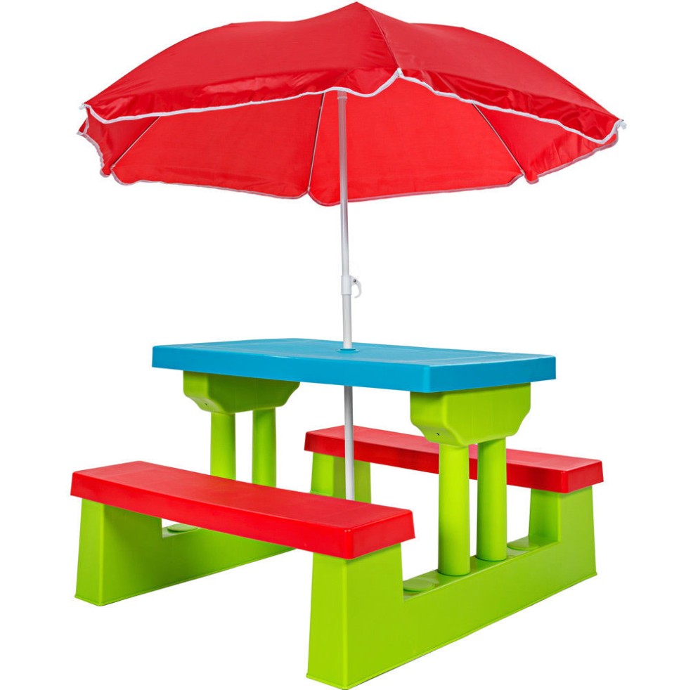 Napernyőt is tartalmazza a készlet, amit be lehet illeszteni a lyukon keresztül az asztal közepére, és megvédi a gyerekeket a káros napsugárzástól.