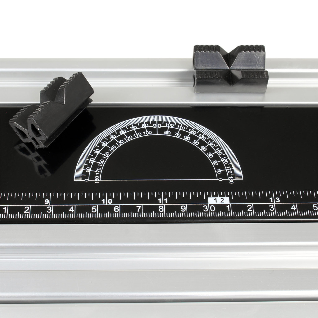 A munkapad két különálló munkafelülettel rendelkezik, amelyek mérték- és szögskálával vannak ellátva, így pontos és precíz munkavégzést tesznek lehetővé. A munkafelületek távolsága kézi tekerőkarok segítségével szabályozható, így különböző méretű munkadarabok is biztonságosan rögzíthetők.