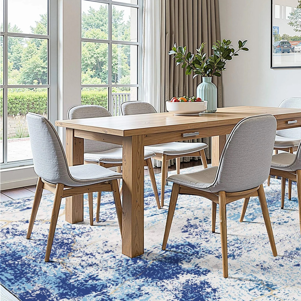 A kék színű rövid szálú szőnyeg friss, nyugodt hangulatot teremt, miközben modern berendezéshez és klasszikus enteriőrhöz egyaránt jól illeszkedik.