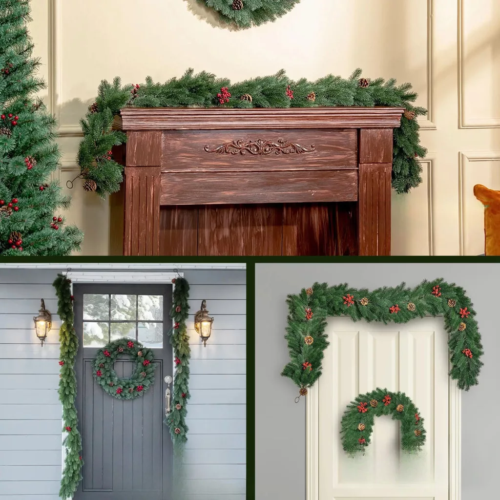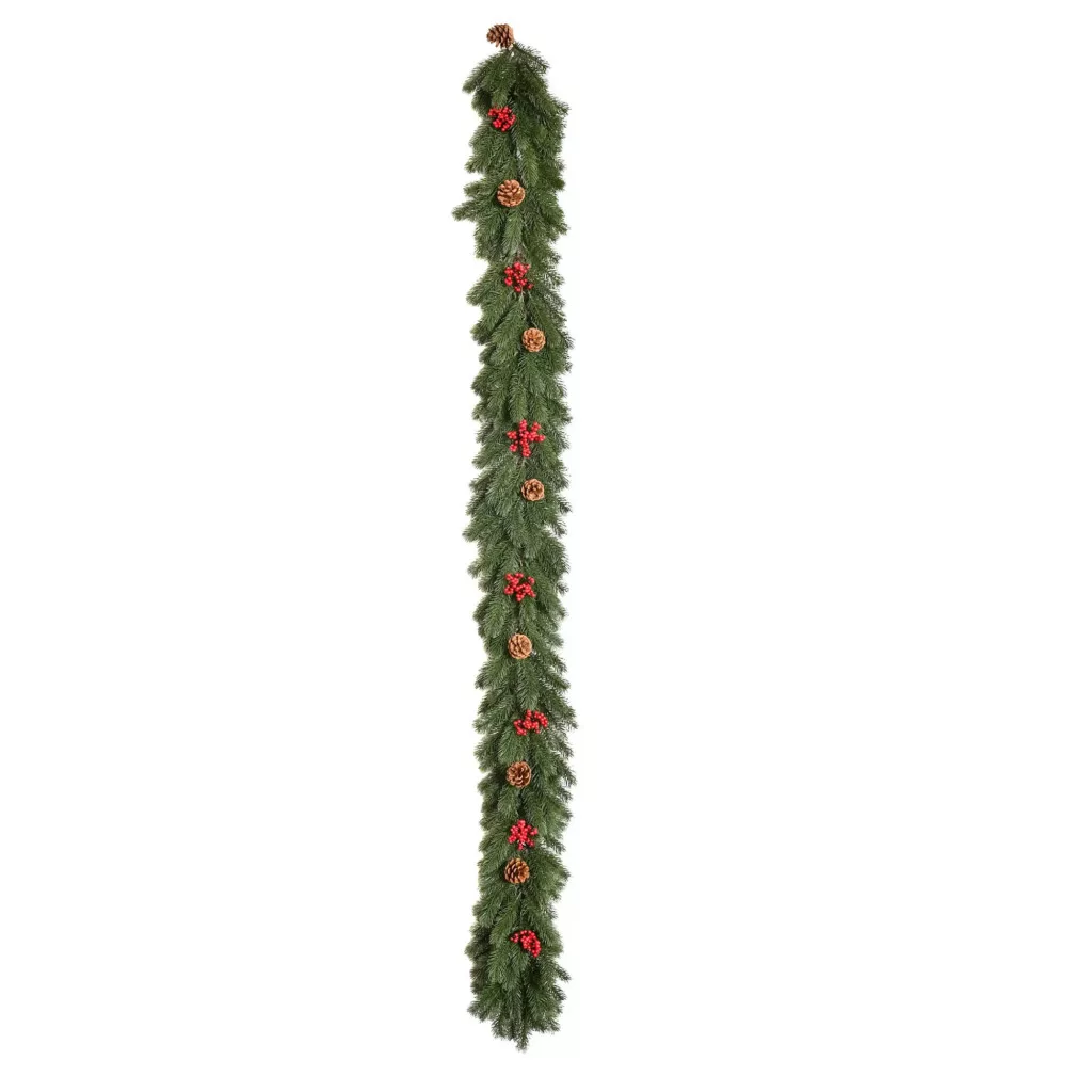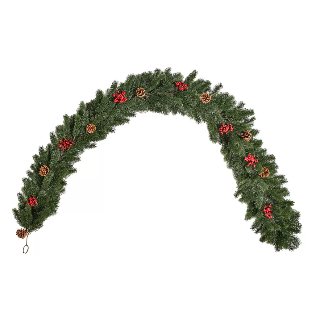 A girland 280 darab élethű ágból áll, melyeket modern öntési technológiával készítenek a lehető legtermészetesebb hatás érdekében. A dekoráció része 7 valódi hatású toboz és 7 élénk piros bogyó, amelyek feldobják a téli hangulatot. Az ágak nem gyűrődnek, tárolásnál könnyen visszaformázhatók.