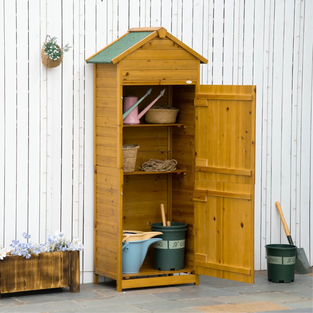 A tömör fenyőfából készült kerti tároló szekrény stabil és időtálló konstrukciót biztosít.