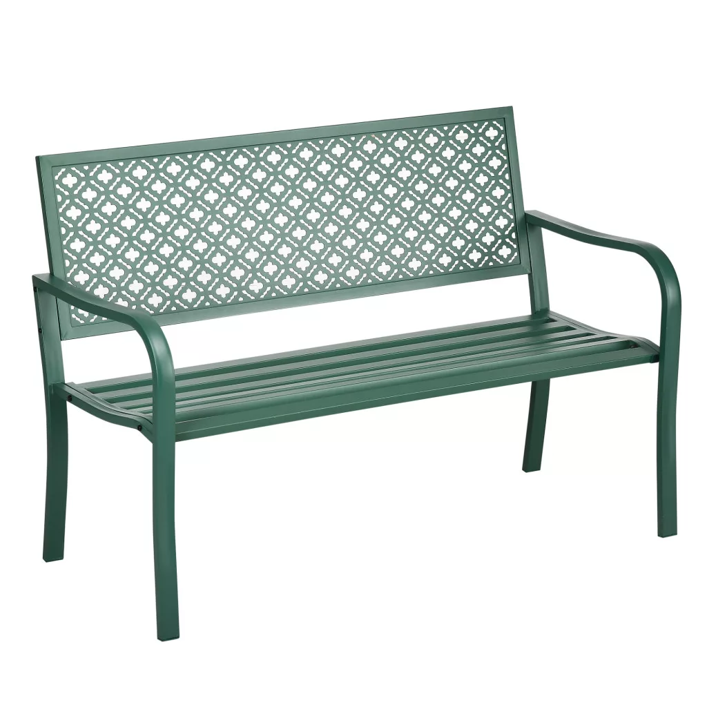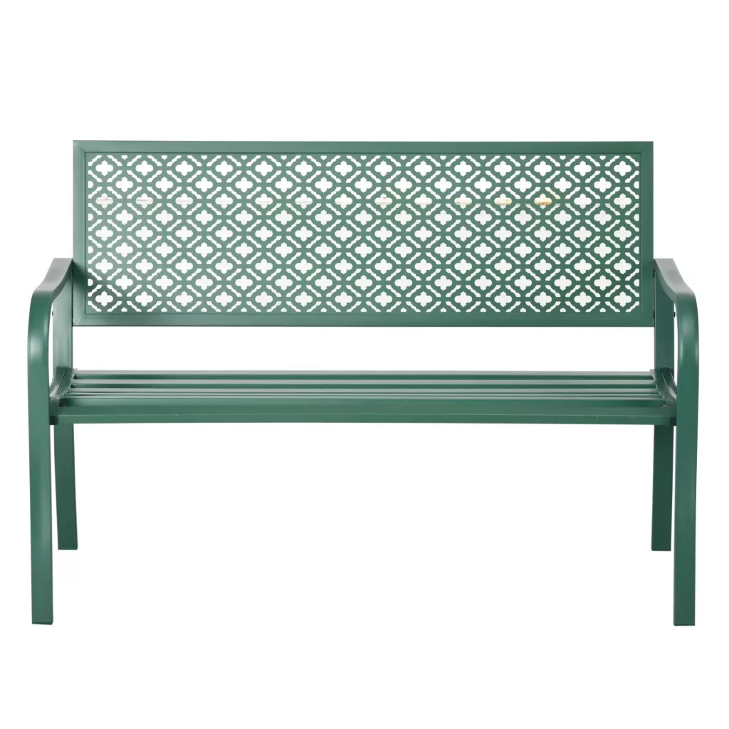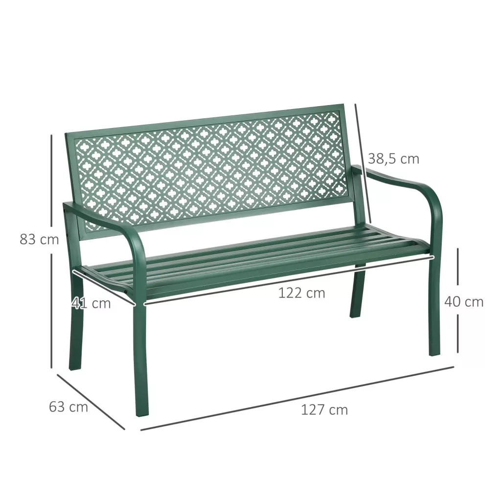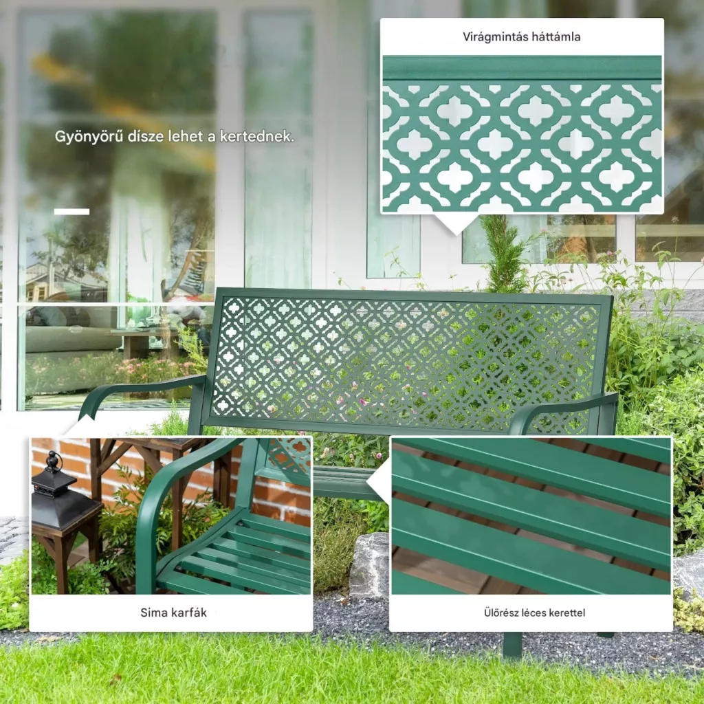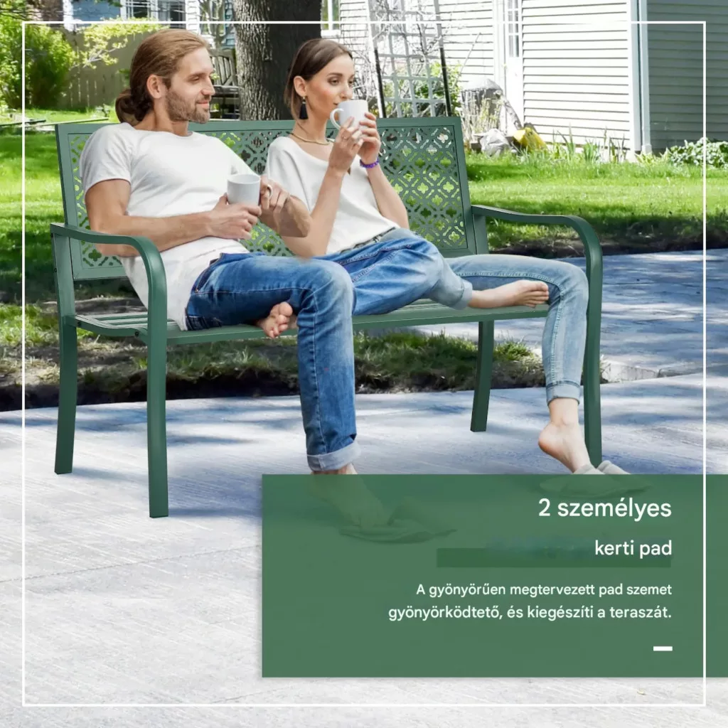 Fém kerti pad 2 személyes kerti pad háttámlával, időjárásálló acél 127x63x83 cm zöld
