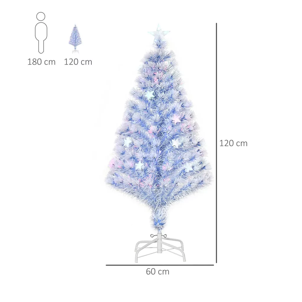 LED-es műfenyő 120 cm fehér–kék karácsonyfa üvegszálas fényekkel, stabil fém talppal