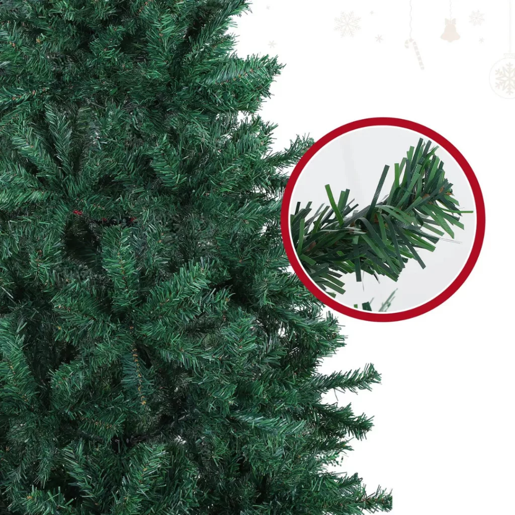 A zöld színű PVC-tűlevelek természetes hatásúak, és bőséges helyet biztosítanak a díszeknek, fényfüzéreknek és karácsonyi dekorációknak.