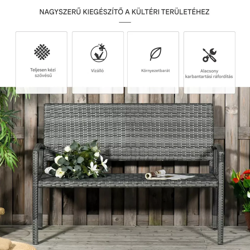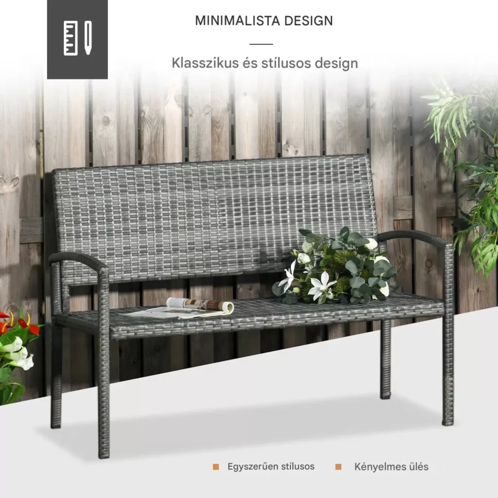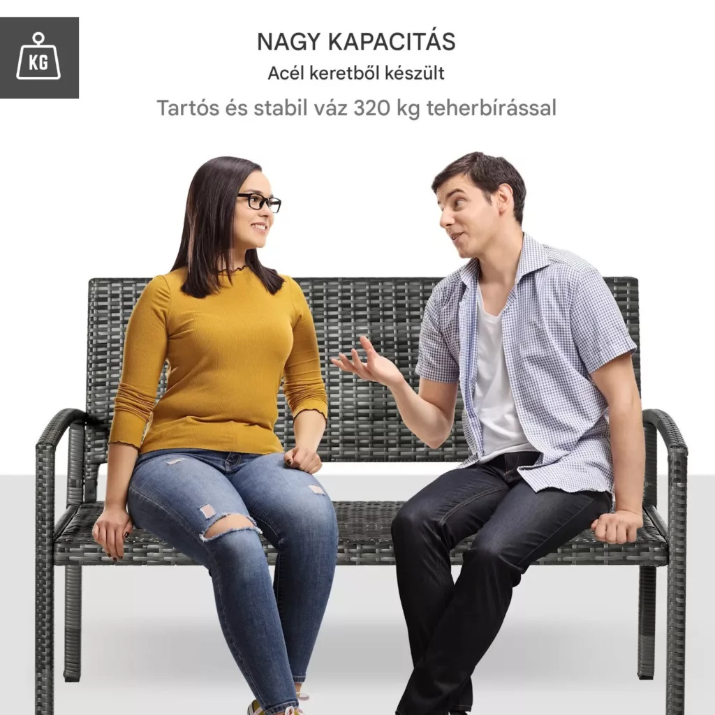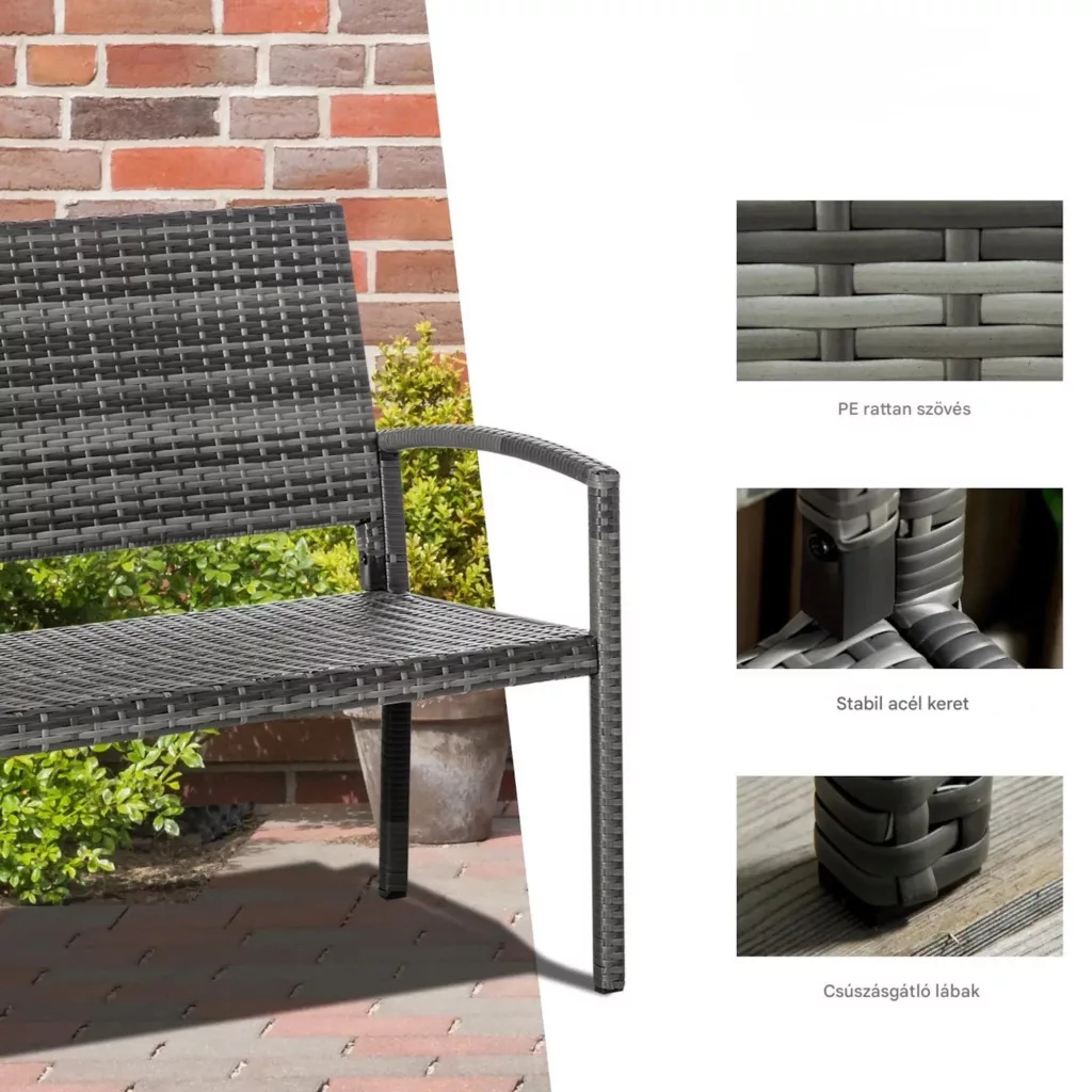 Ha Ön egy stílusos, mégis rendkívül strapabíró kültéri bútort keres, ez a polyrattan kerti pad tökéletes választás lehet. A természetes rattan megjelenést idéző kialakítás és a masszív szerkezet ideális kombinációt alkot, így ez a 2 személyes kerti pad nemcsak kényelmes, hanem hosszú távon is megbízható megoldást kínál.