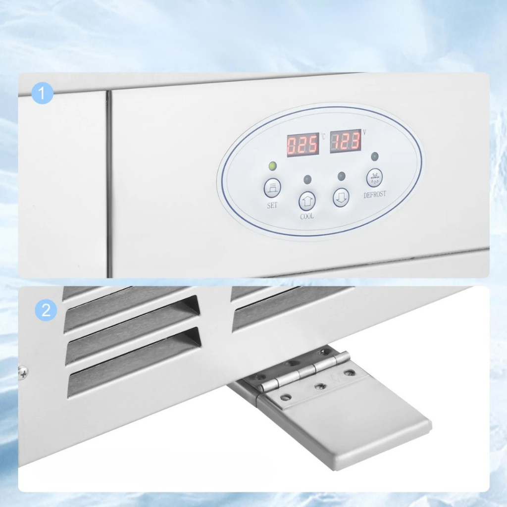 A 304-es rozsdamentes acél fagyasztófelület élelmiszerbiztonságot és hosszú élettartamot garantál, míg a 201-es acél külső borítás ellenáll a korróziónak és könnyen tisztítható.