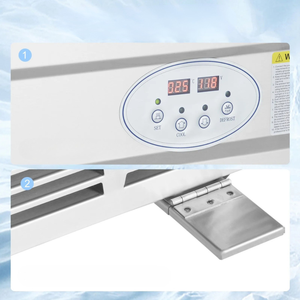 • Rozsdamentes acél kivitel – Az élelmiszeripari minőségű SUS304 acél munkafelület és a SUS201 acél burkolat hosszú élettartamot, higiénikus használatot és egyszerű tisztíthatóságot garantál.
