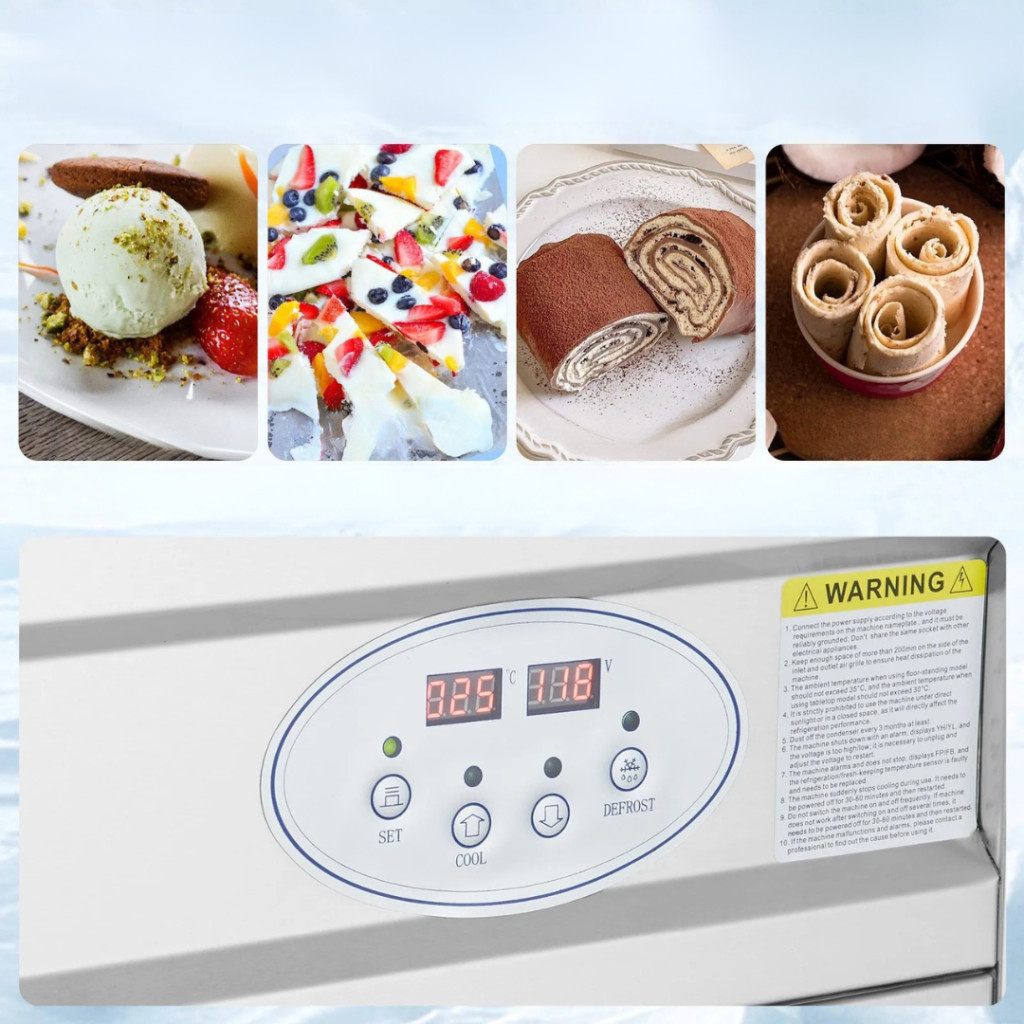 Ez a professzionális sült jégtekercs készítő fagyigép kiváló választás éttermeknek, cukrászdáknak, fagylaltozóknak vagy akár rendezvényszervezőknek is, akik különleges élményt szeretnének nyújtani vendégeiknek.