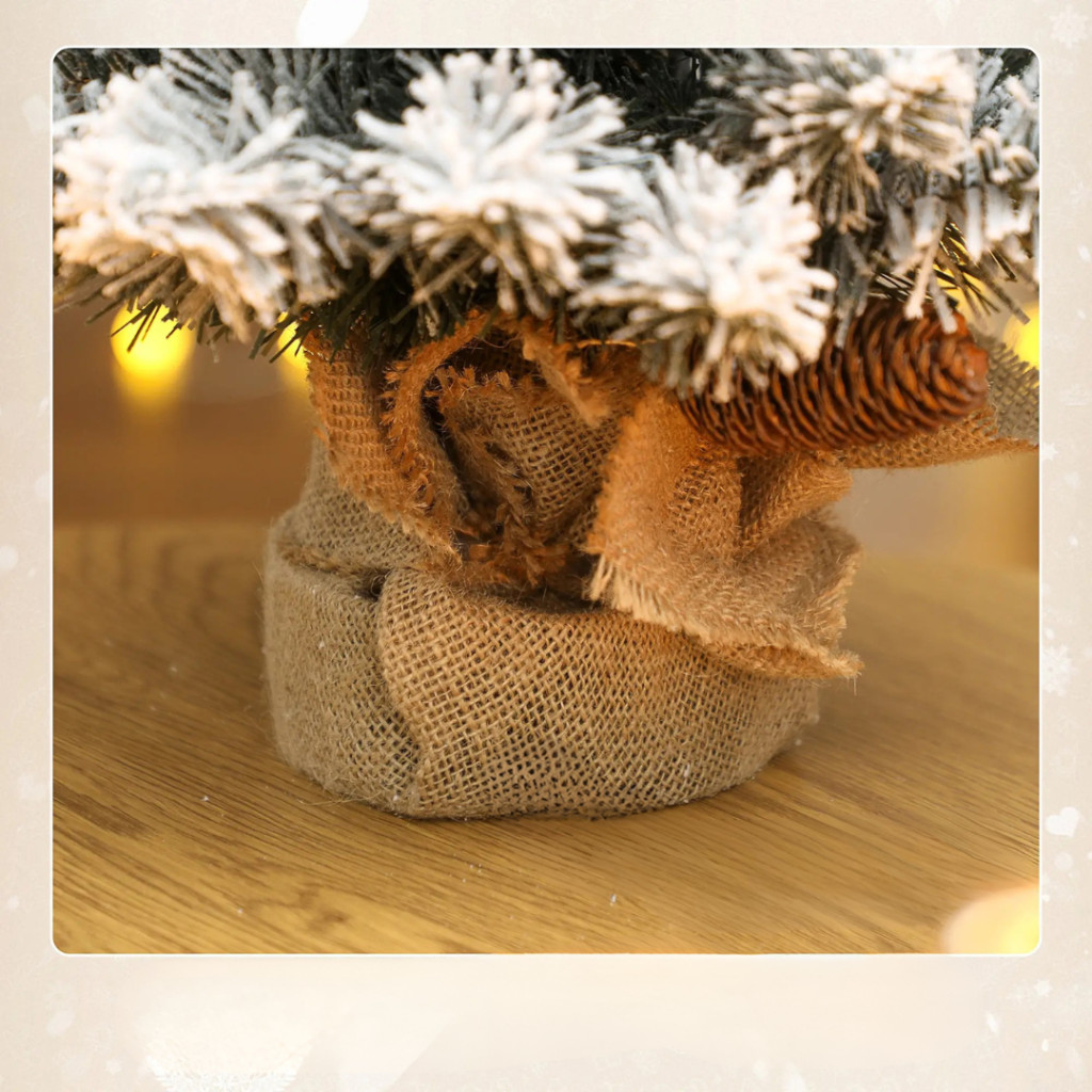 Mini műfenyő karácsonyfa 60 cm magas, havas hatású, 72 ággal, 6 tobozzal, beton talppal és lenvászon borítással