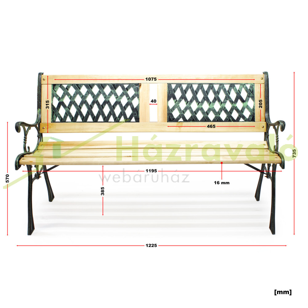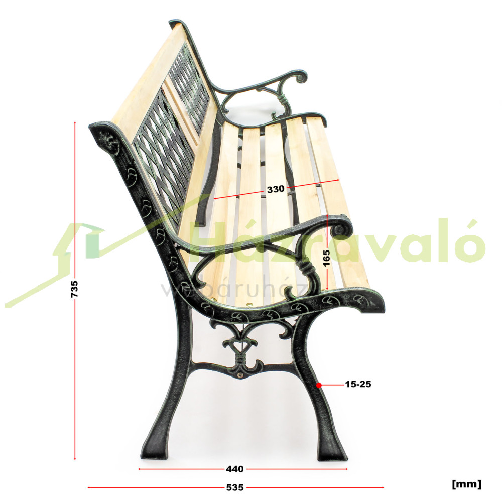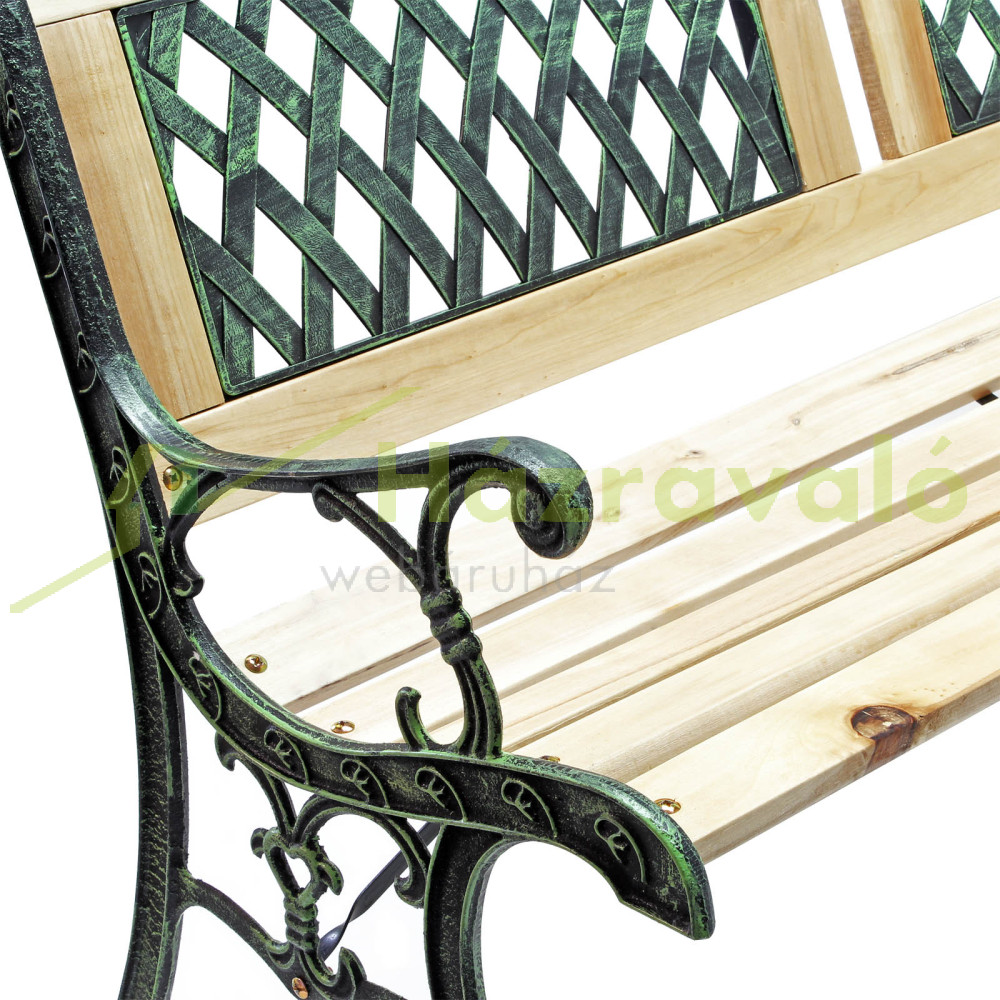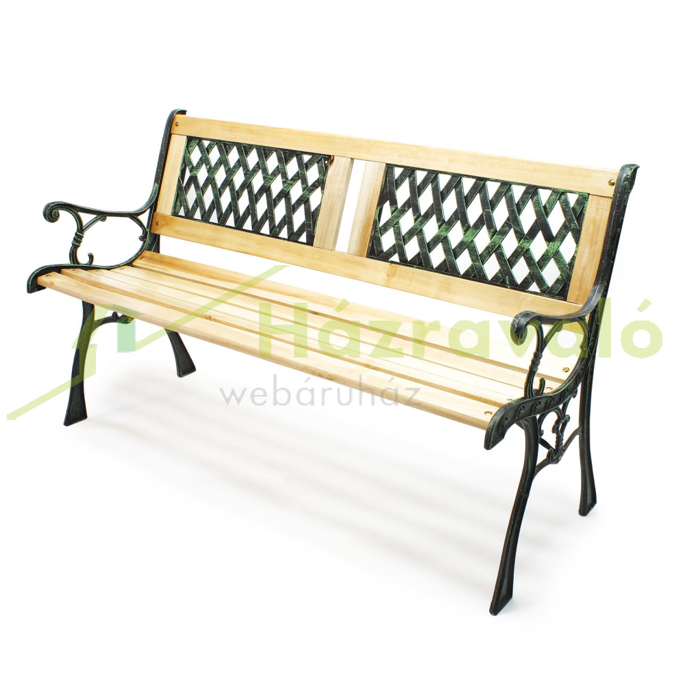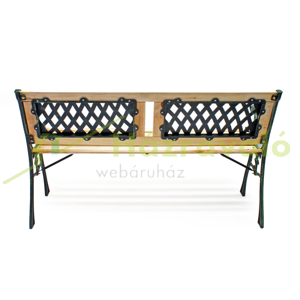 Anyaga: öntöttvas keret, fenyőfa pad és háttmámla műanyag betéttel