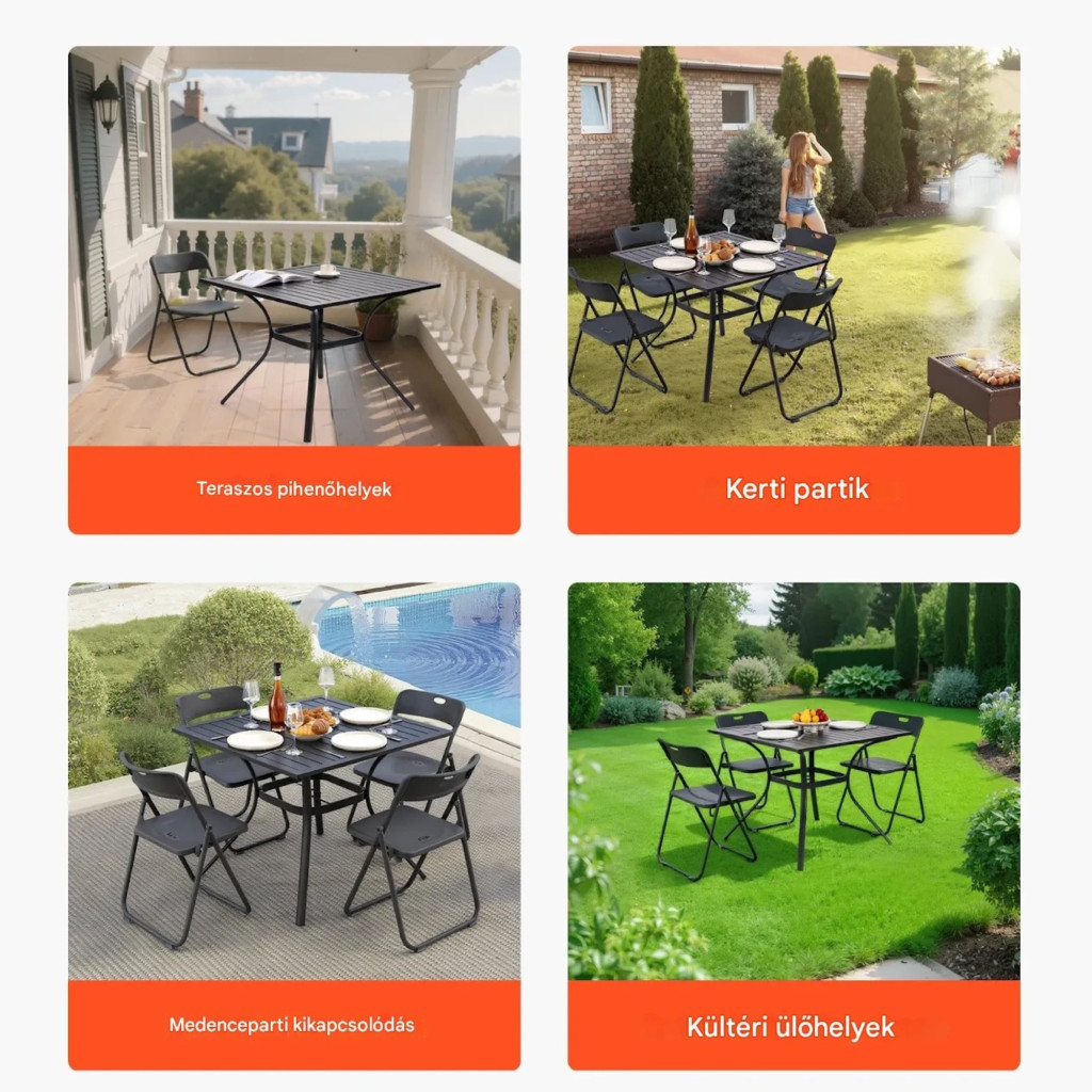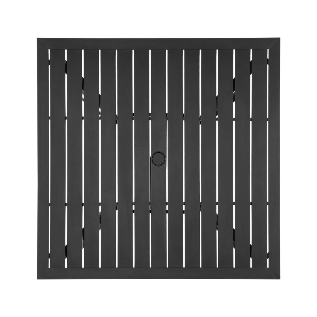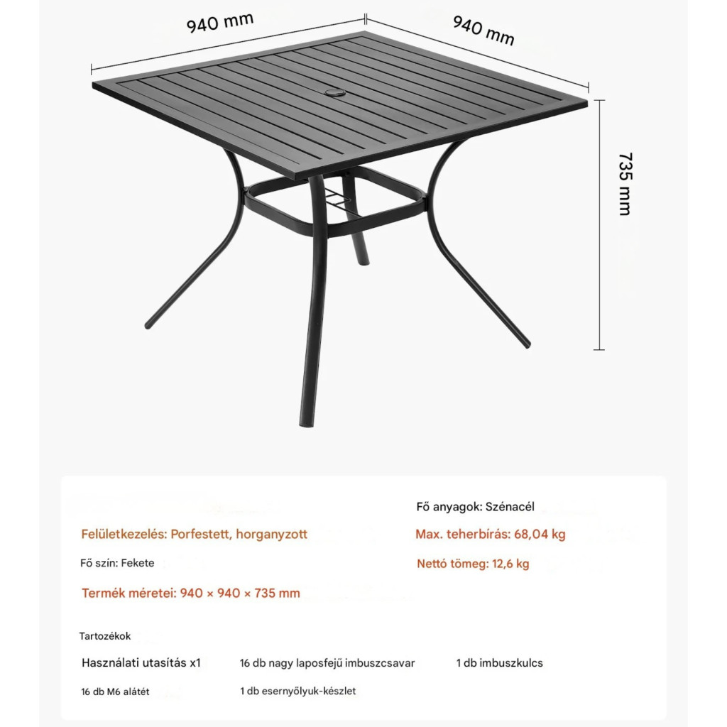 Kerti asztal 94x94 cm négyzet alakú kültéri étkezőasztal vízálló, napernyőnyílással 68 kg teherbírás, fekete