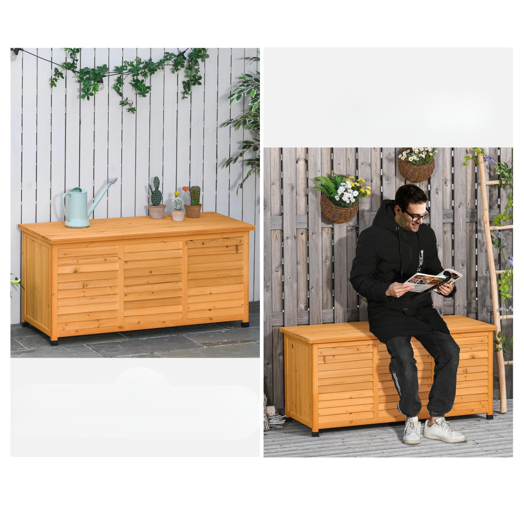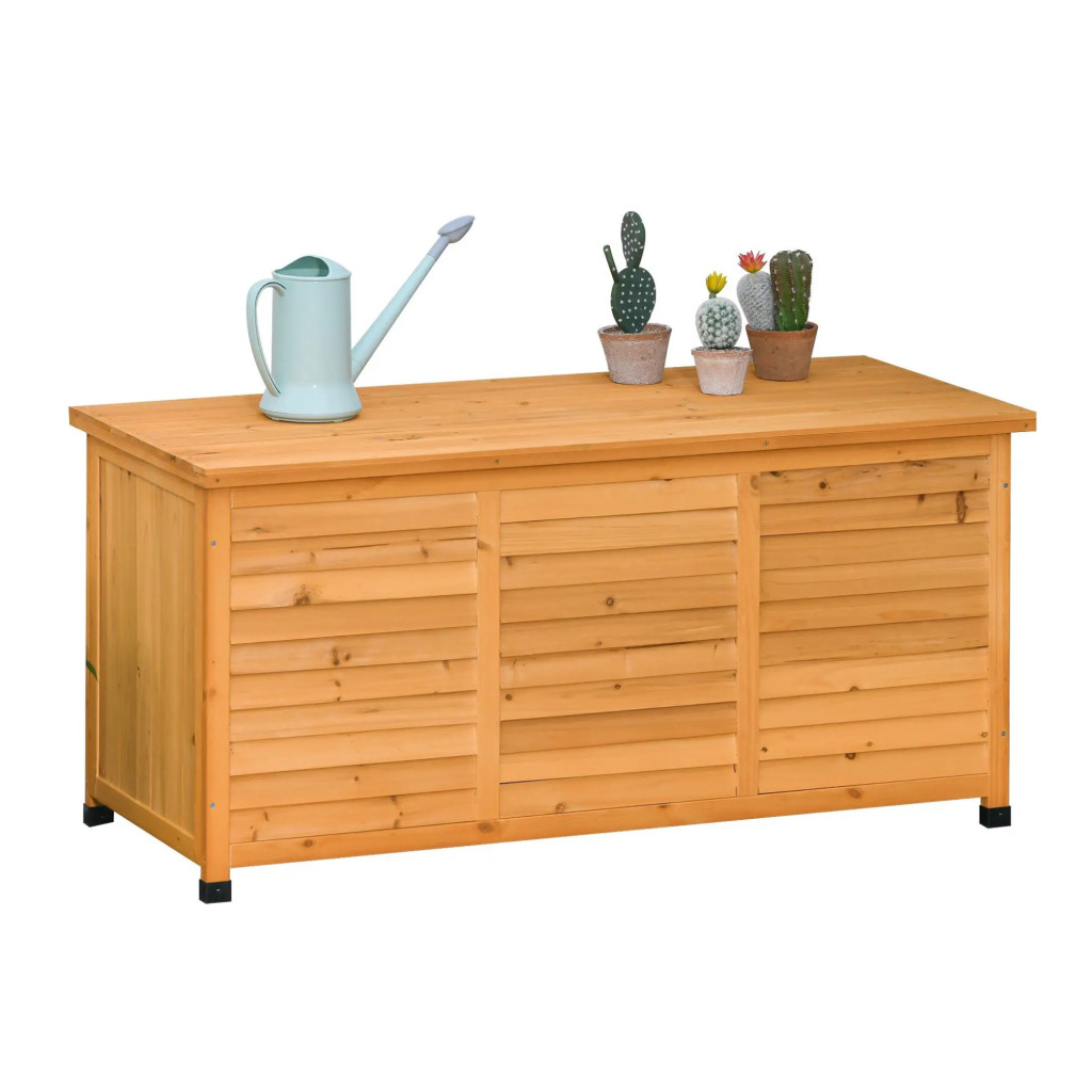 A fenyőfából készült kerti tároló box stabil és tartós konstrukcióval rendelkezik.