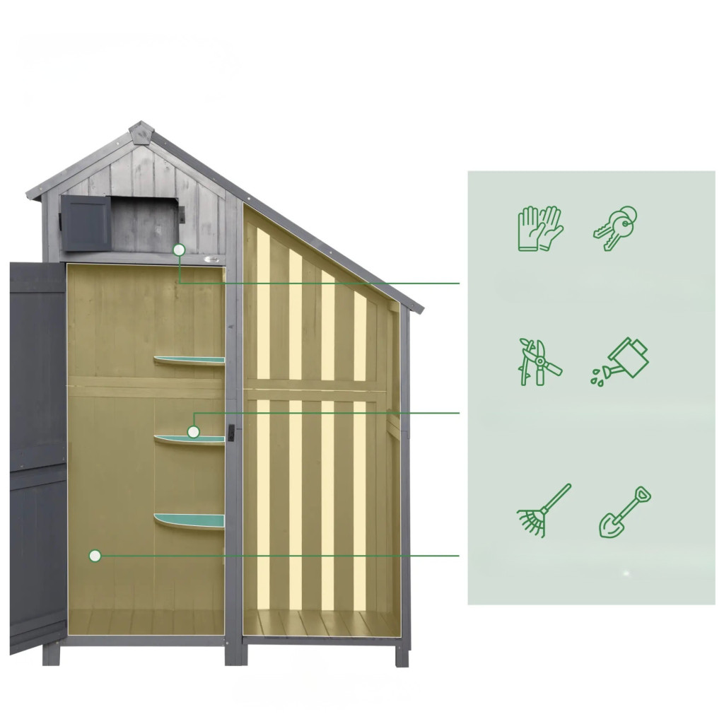 A ferde tetős kerti tároló szekrény hatékonyan vezeti el az esővizet, így védi a szerkezetet és a benne tárolt eszközöket.
