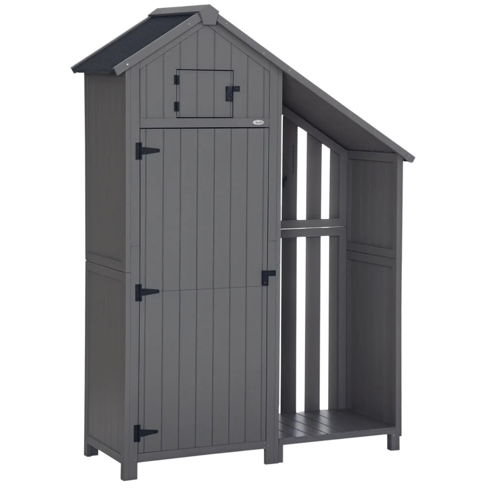 Kerti szerszámtároló ház tűzifatárolóval 129x51,5x180 cm fa kerti tároló szekrény szürke-fekete